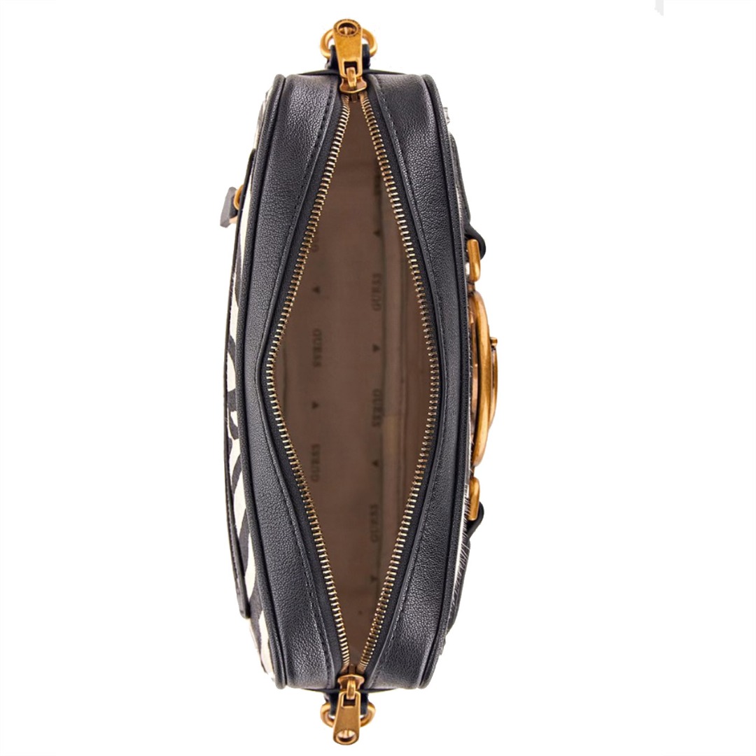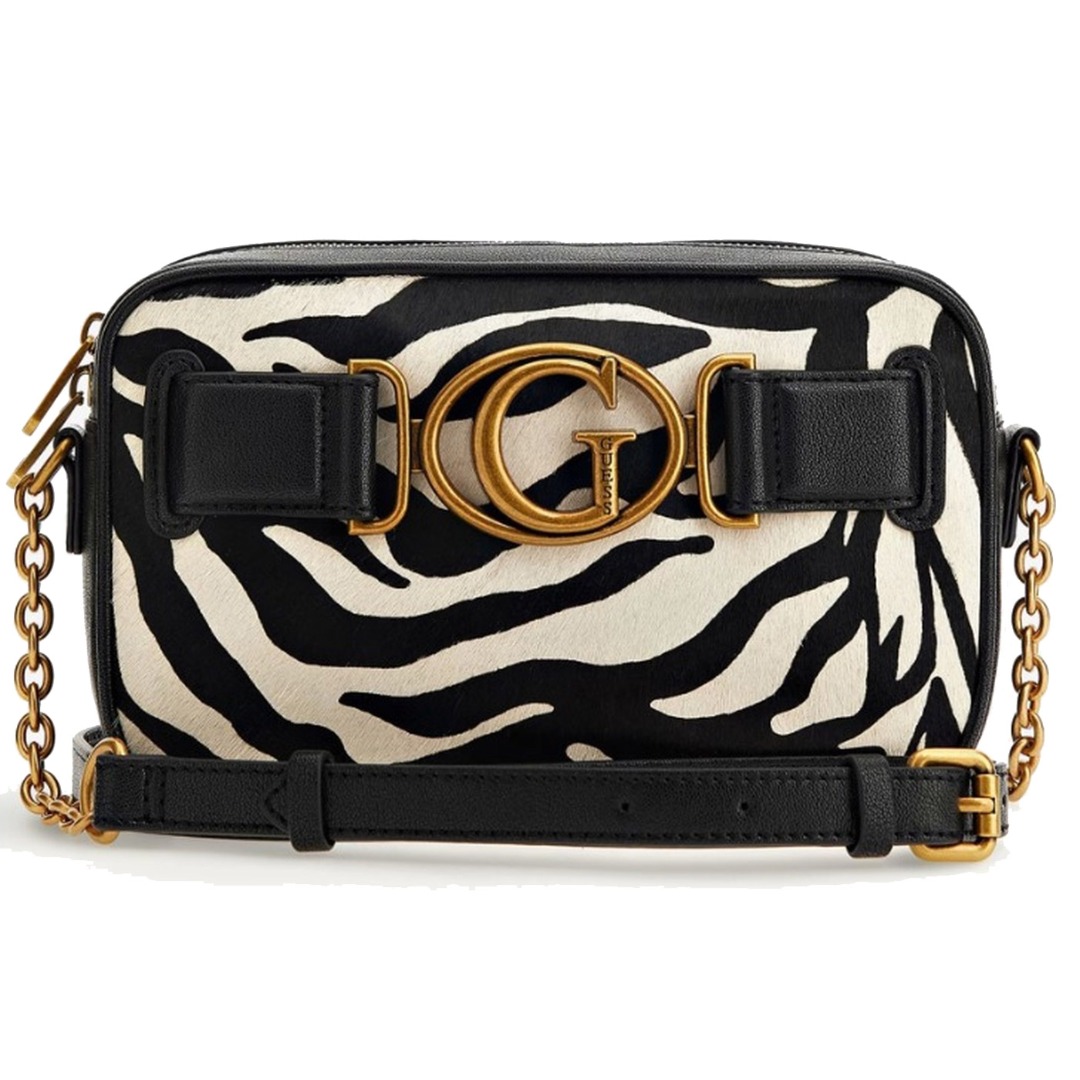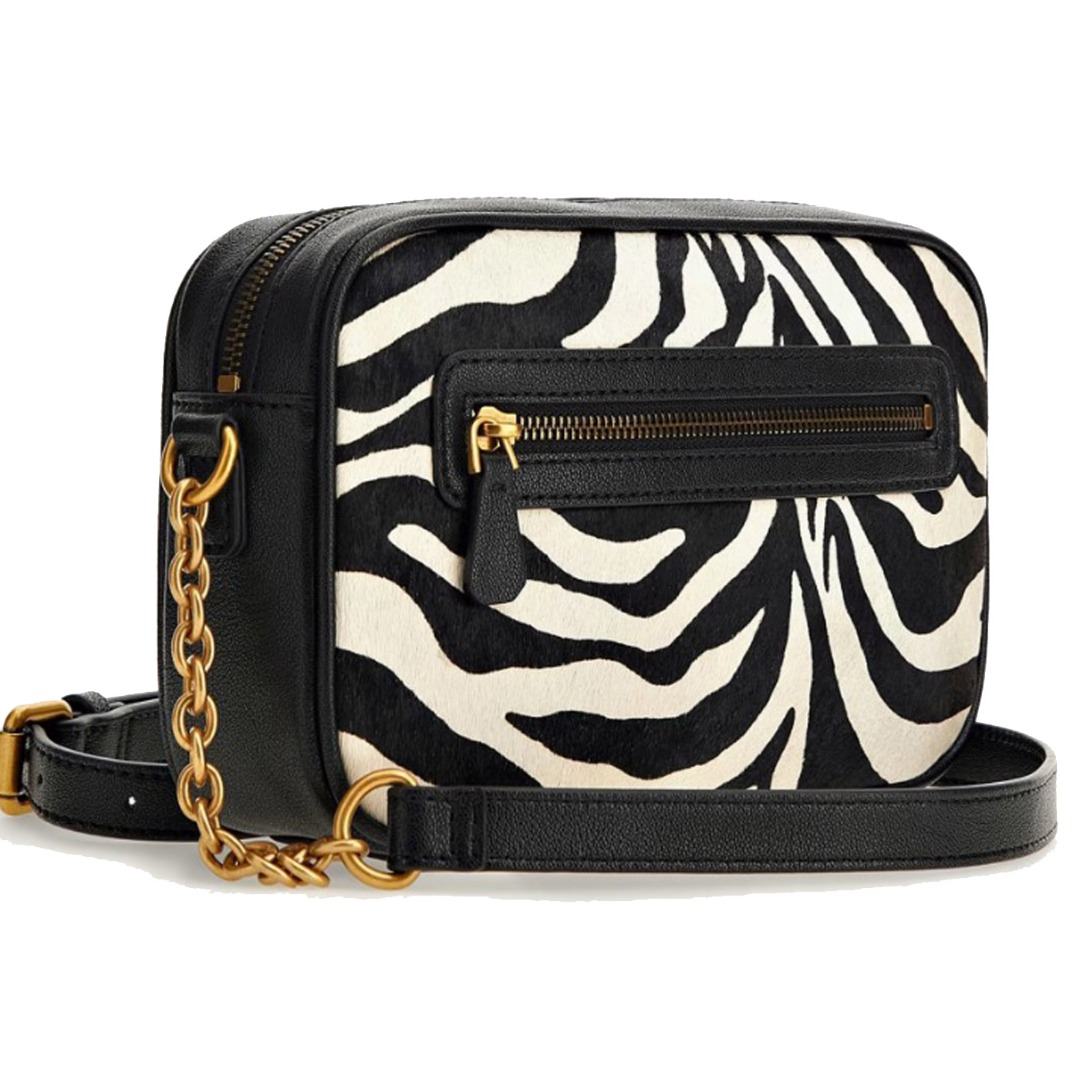 Genuine leather exterior. Zip closure. Gold colored hardware. Pony-effect zebra print. Front metal logo writing. Measures 25x16x6 cm. Adjustable shoulder strap with chain length approx. 110/130cms.