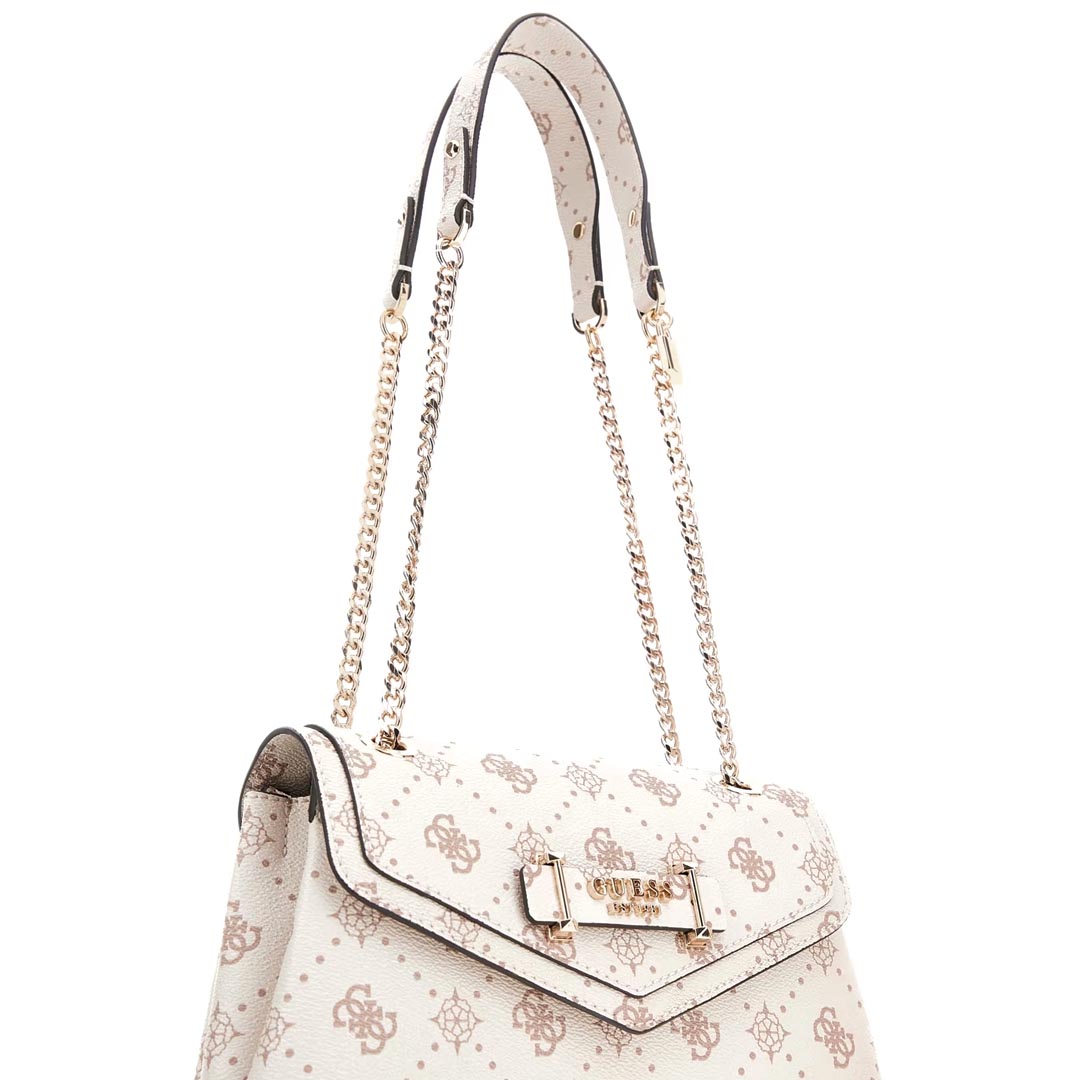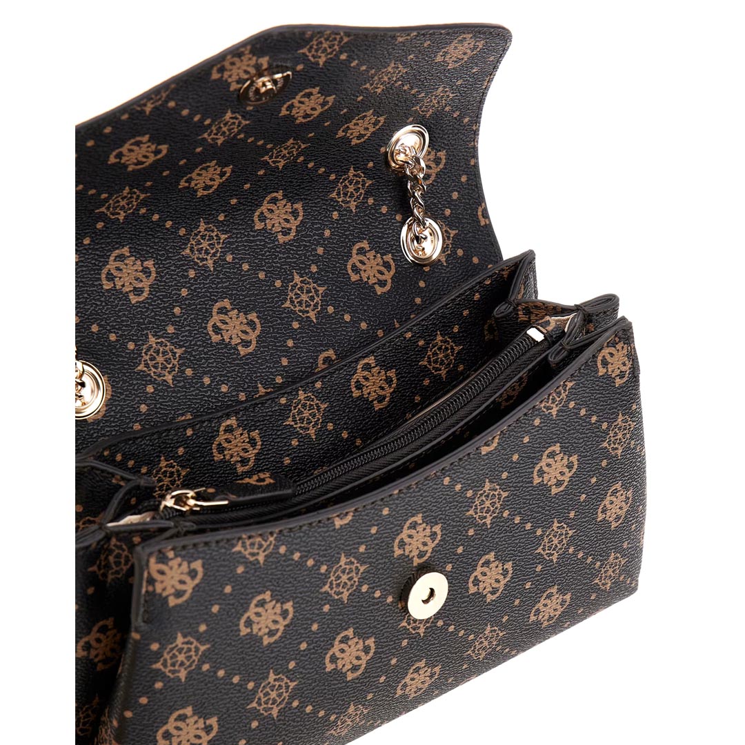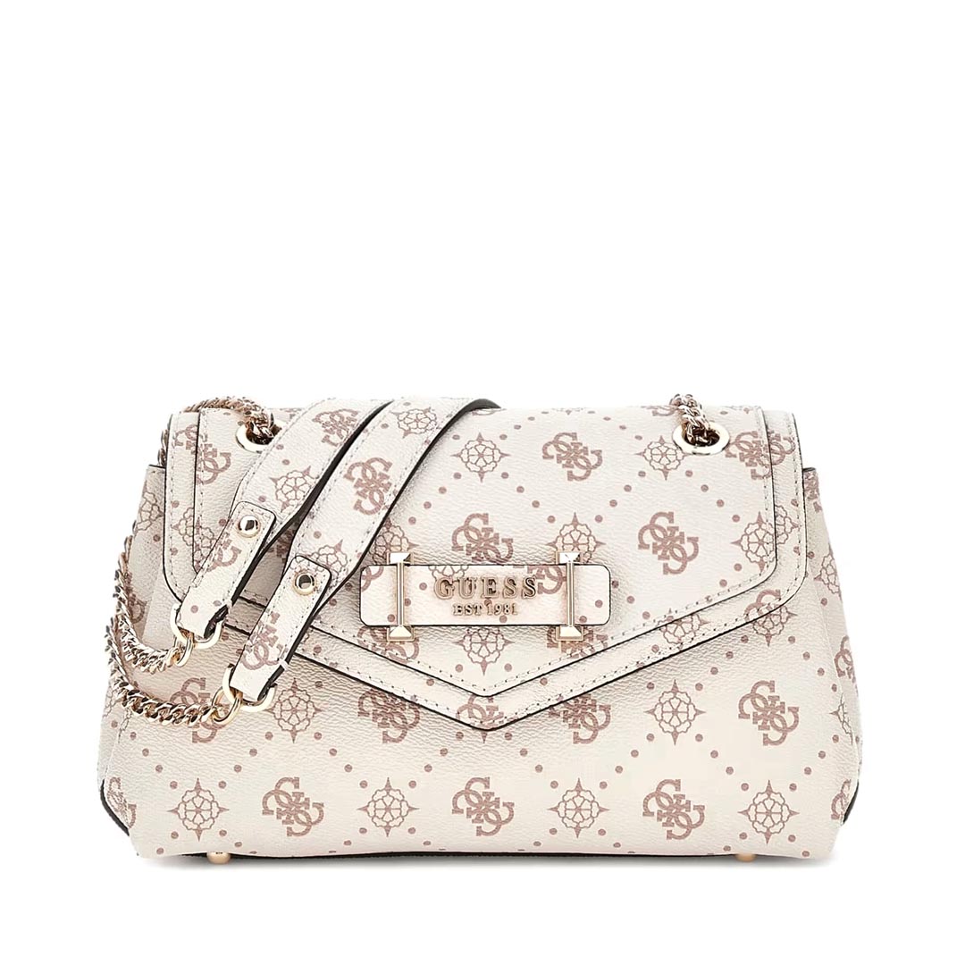 Faux leather exterior. Flap and button closure. Pale gold-tone hardware. Family: Silia. 4G print and peony logo. Personalized logo lining. Double interior compartment. Internal and back zipper pockets. Logo lettering with metal details on the front. Dimensions: 28 x 16 x 8 cm. Two chain handles, length approx. 45 cm.