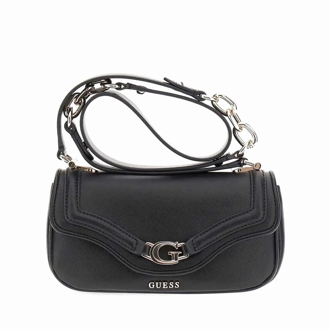Faux leather exterior. Flap closure with double button. Pale gold-tone hardware. Family: Dea. Double interior compartment. Metal logo lettering on the front. Dimensions: 23 x 12 x 5 cm. Shoulder strap with chain detail, length approx. 110/130 cm.