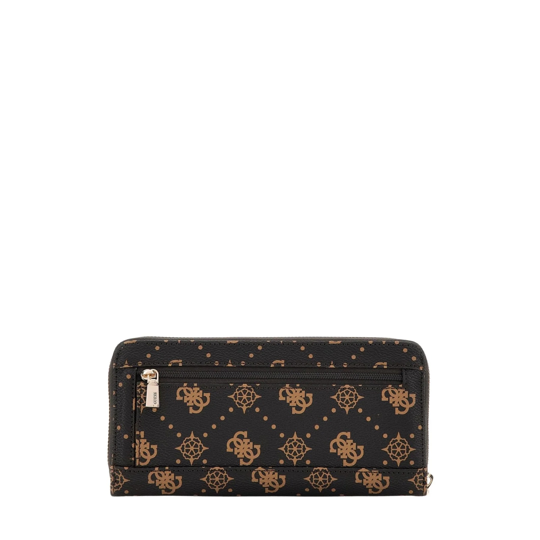 The wallet is made of polyurethane with an all-over logo and another metal logo on the front. It features a removable side strap, zip closure, and a zip pocket on the back. The interior is lined, divided into compartments, and a zip pocket for coins. 21 x 10 x 2 cm