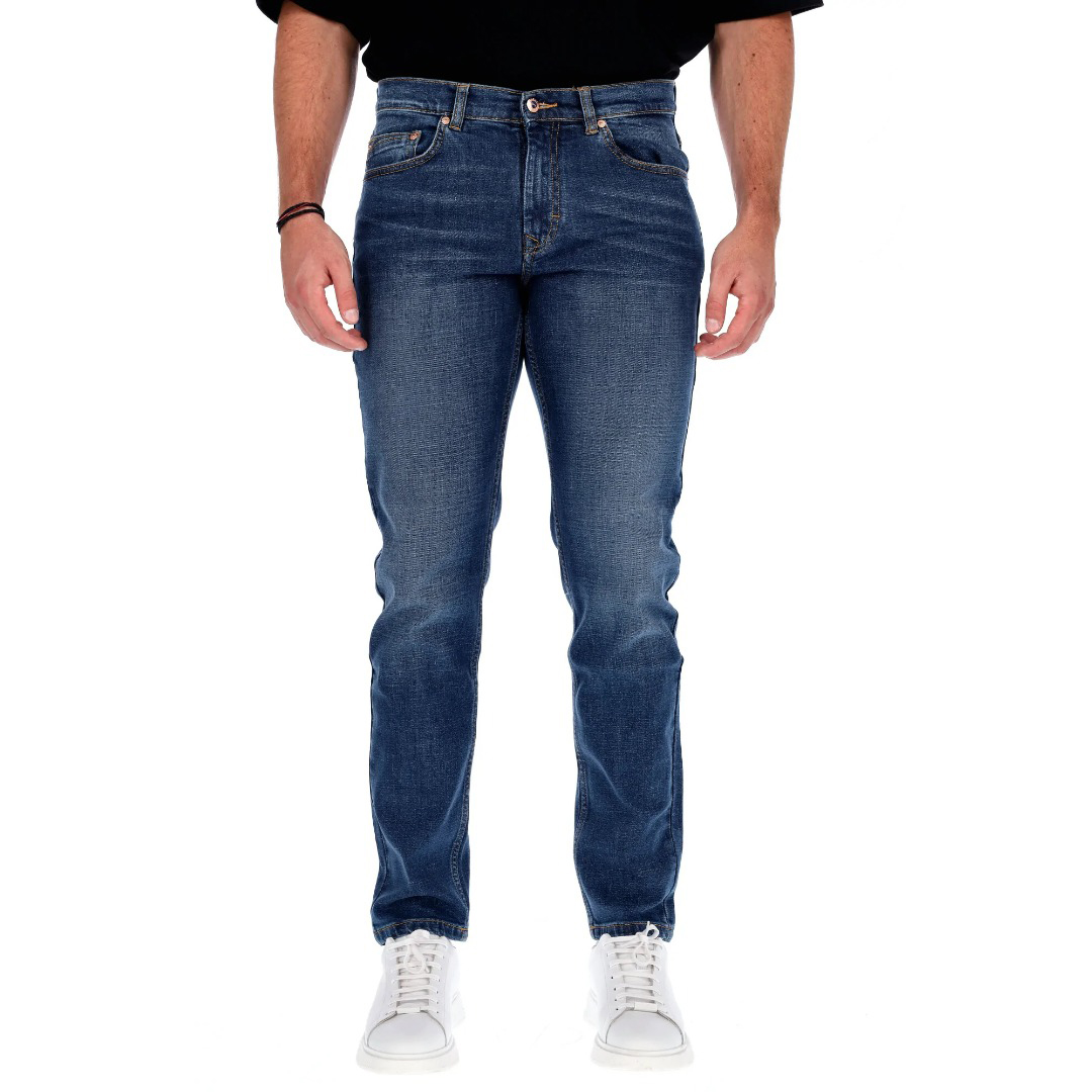 Men's 5-pocket jeans with welt pocket, zip and button closure and back pockets with fabric detail and embroidered monogram