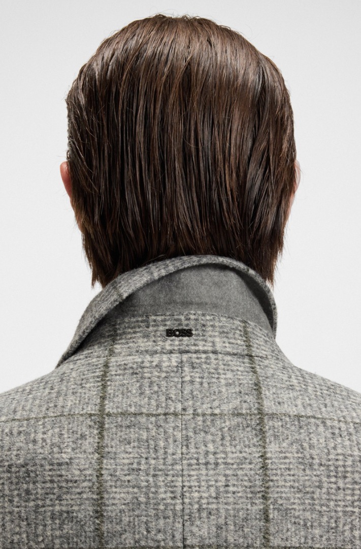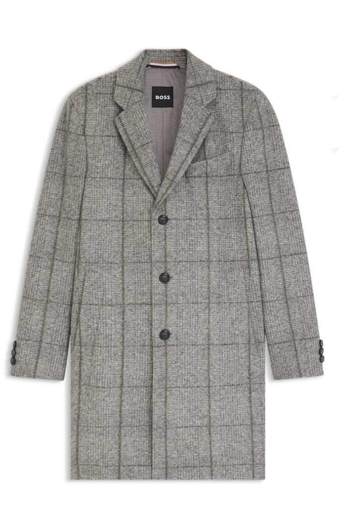 Crafted from a wool blend with two-way stretch, this slim-fit BOSS Menswear coat is a classic layering piece. It features a versatile check pattern. Slim fit. Peak lapels. Number of buttons: 3. Welt chest pockets. Top pockets: Side pockets. Buttoned cuffs. Back vent. Fully lined.