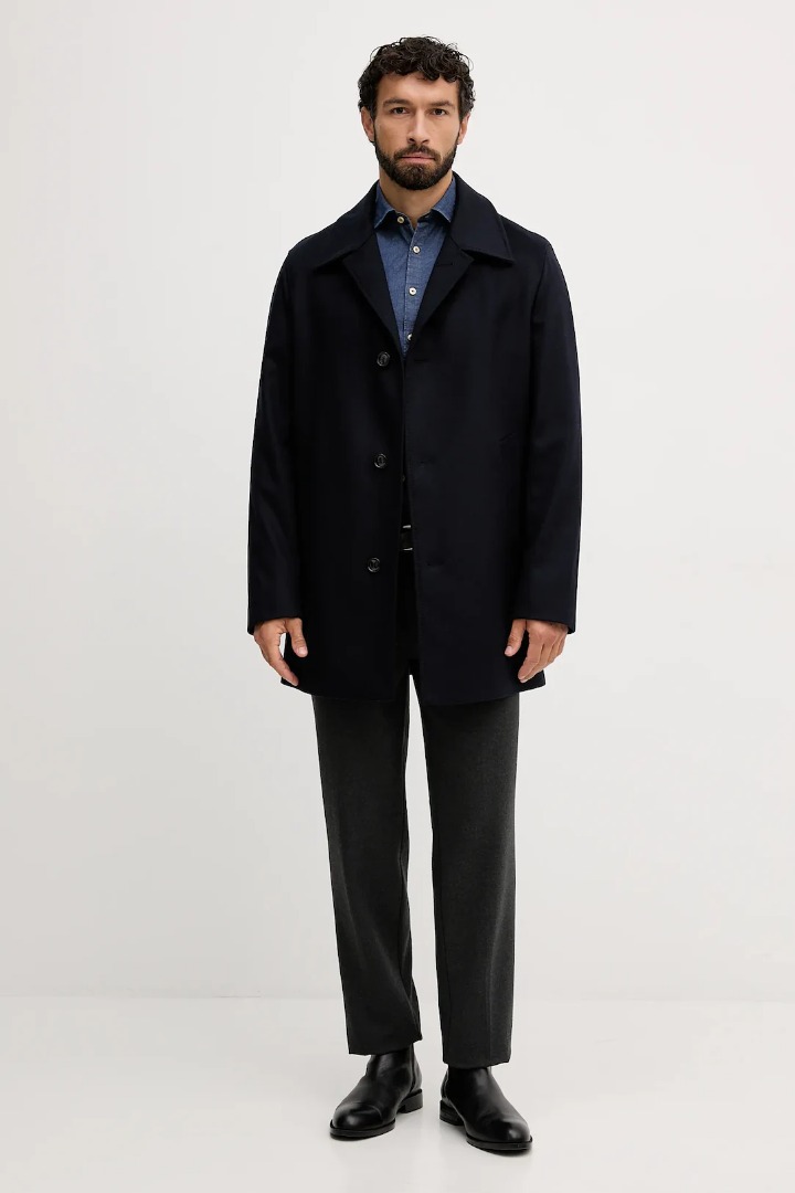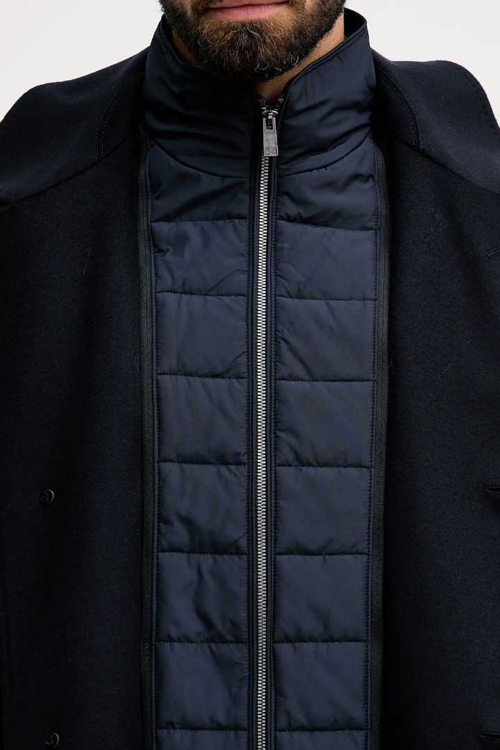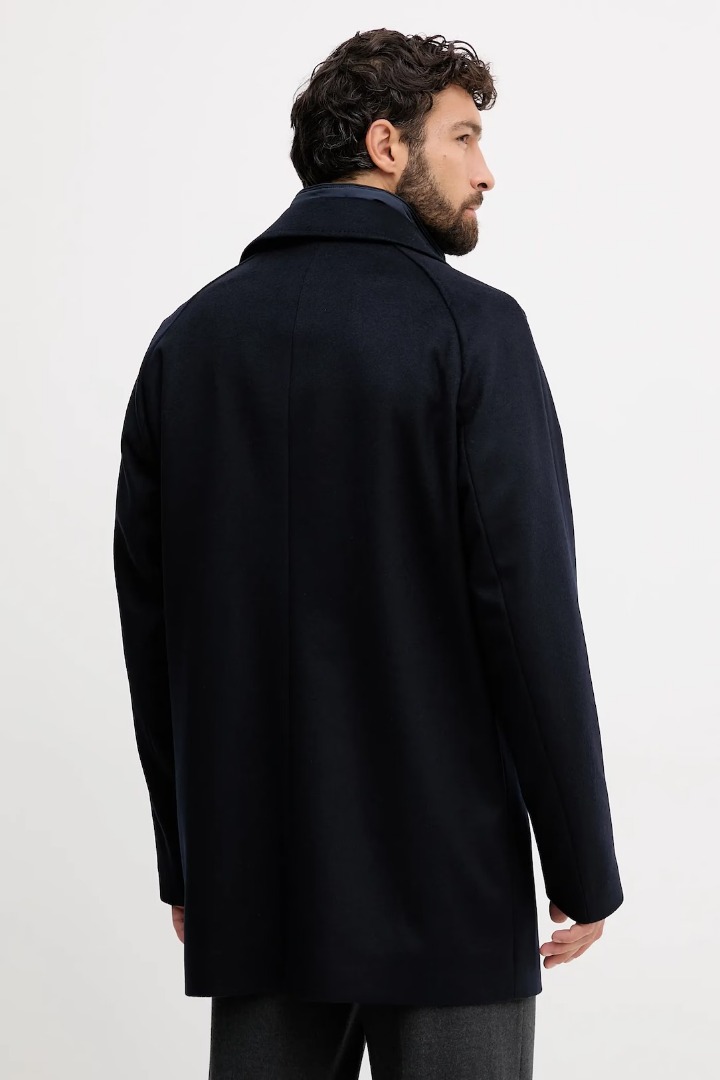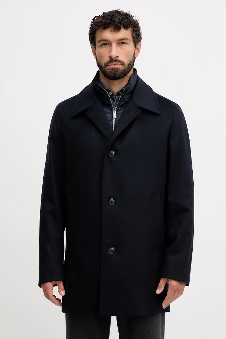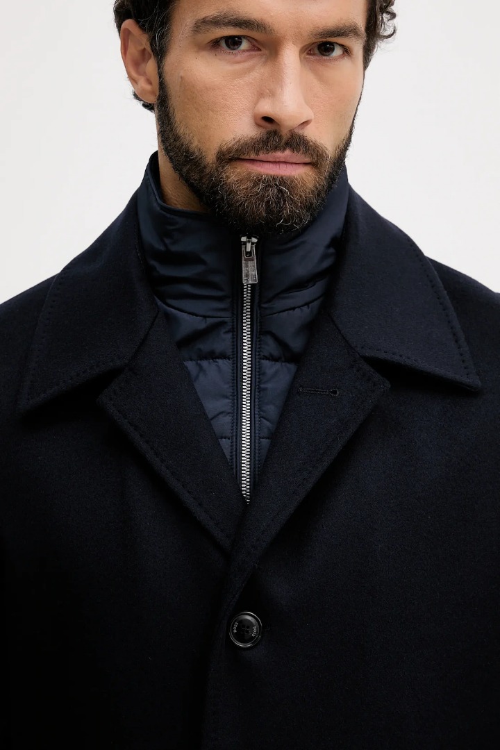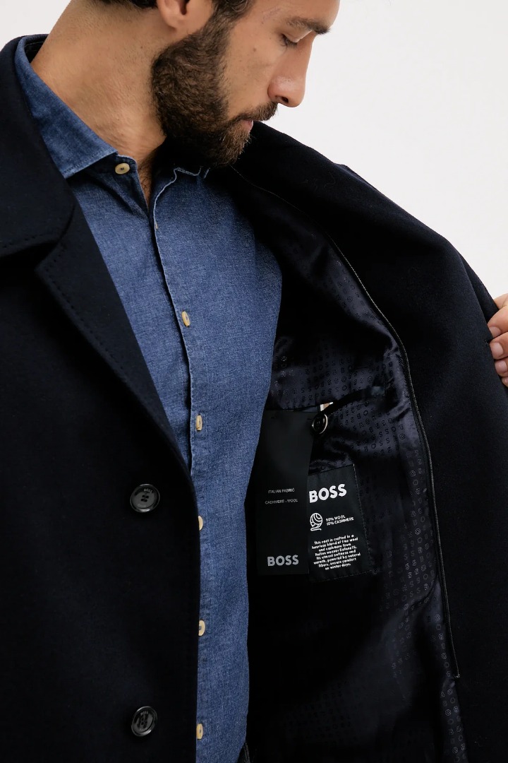 Boss coat in dark blue wool and cashmere blend. Classic lapel. Nylon zip-up front. Inset pockets. Inside pockets. Lined. Button closure. Slim fit.