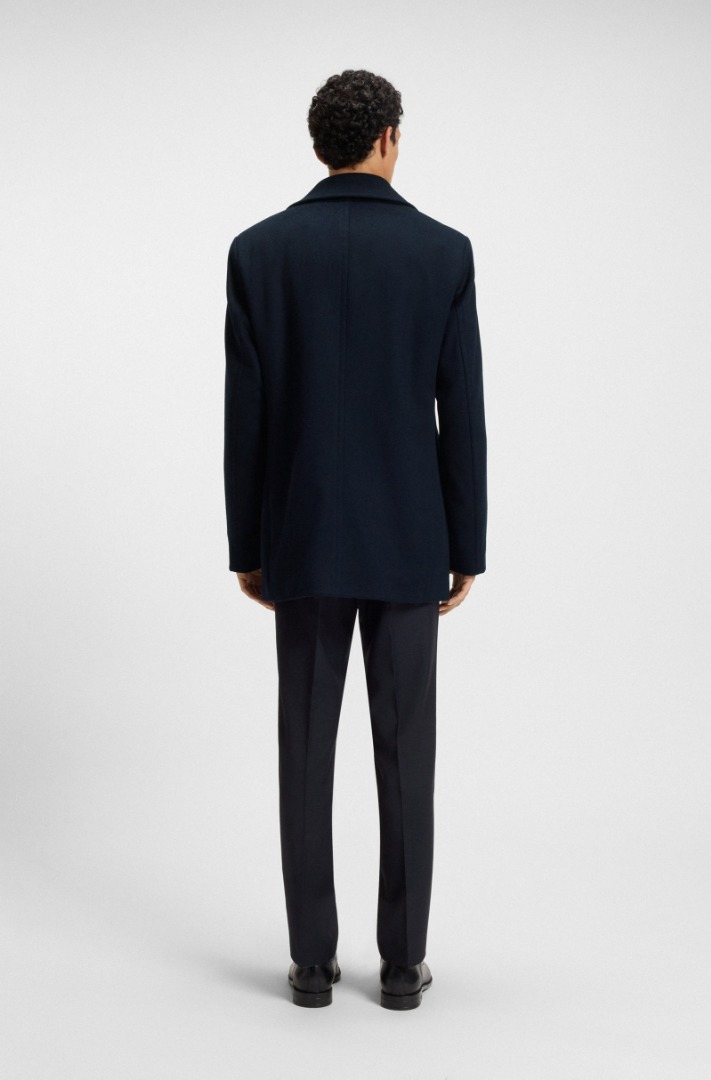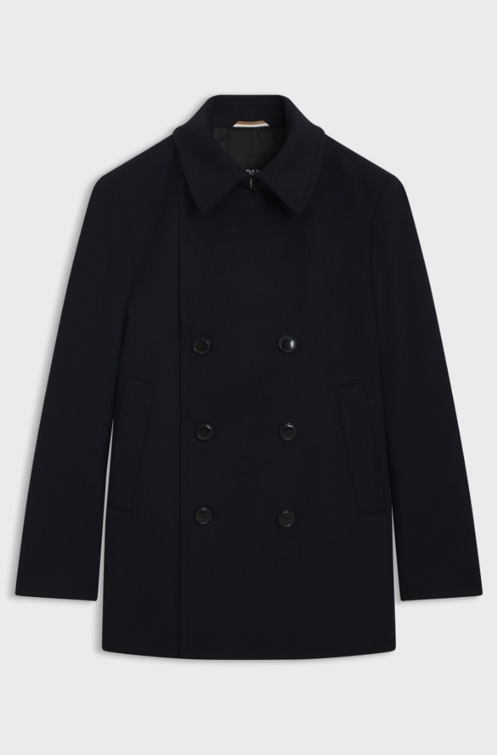 Combining soft wool and fine cashmere, this BOSS Men's pea coat is a refined interpretation of a classic. Slim fit with a double-breasted closure. This product contains at least 60% premium raw materials. This product is partially made from recycled wool. When using certain materials, such as wool, we combine recycled and virgin material to offer a high-quality product. Slim fit. Wide lapels. Number of buttons: Double-breasted. Front pockets: Side-entry pockets. Fully lined. Regular back length: 82 cm.