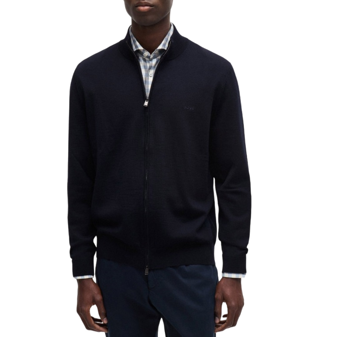 A regular-fit BOSS zip-front cardigan. This knitted piece features an embroidered BOSS logo on the left chest. This piece is crafted from responsibly farmed wool. For us, being a responsible farm means being mulesing-free and adhering to the Five Freedoms standards for animal welfare. Regular fit Mandarin collar Long sleeve Standard length