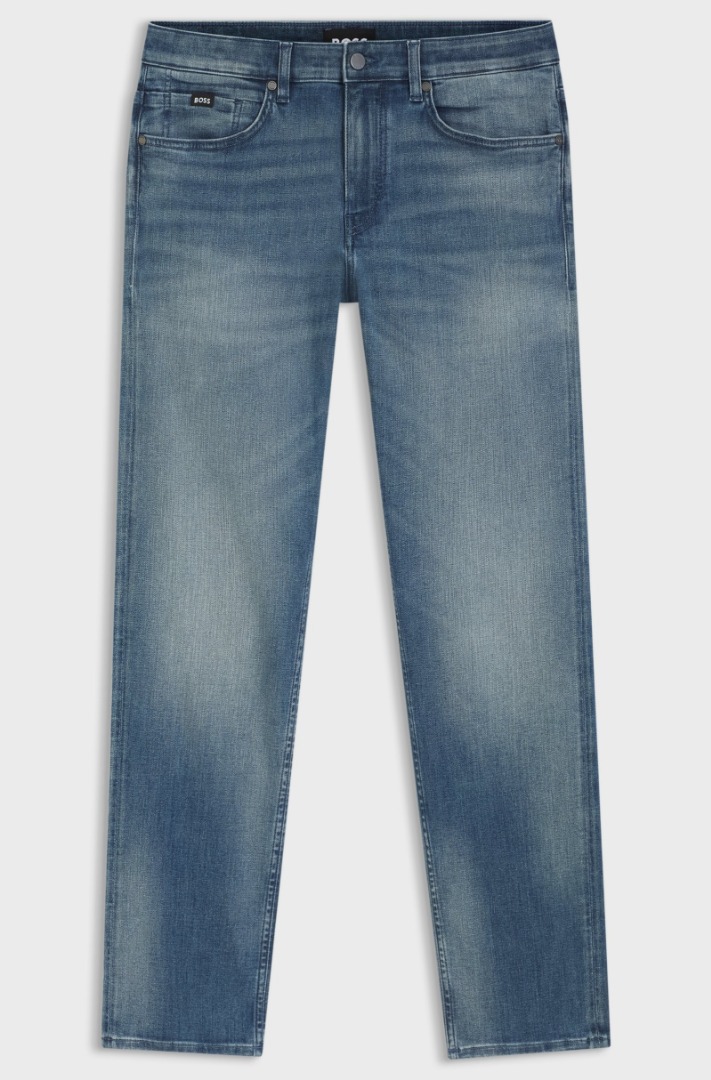 BOSS Men's slim-fit jeans with a regular waist, crafted from lightweight denim for comfort. Logo detail on the coin pocket. Slim fit. Regular waist. Button and zip fastening. Lower front pockets: Side pockets. Slim leg. Lower back pockets: Patch pocket. Standard length.