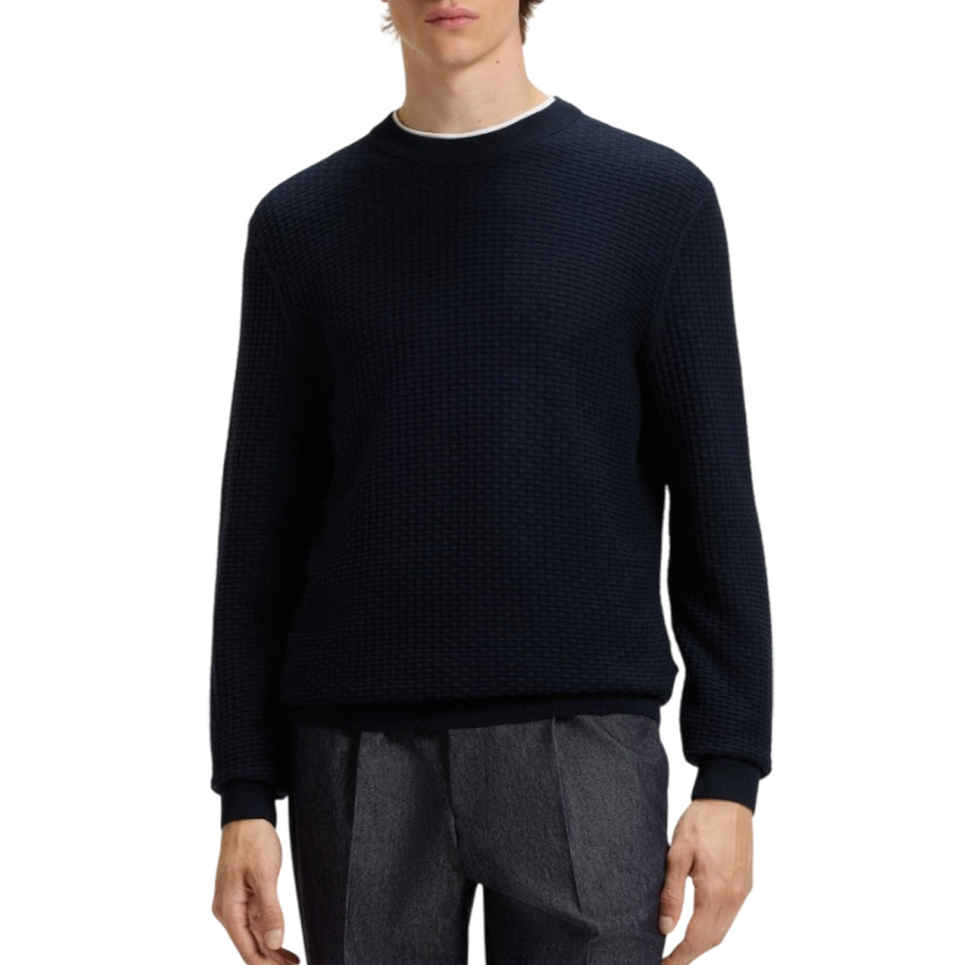 Featuring classic elegance and expert craftsmanship, this BOSS Men's sweater features a premium finish in soft cotton. Regular fit. This product contains at least 80% premium raw materials. This product is made with at least 80% cotton from regenerative agriculture. Regenerative agriculture prioritizes the conservation and restoration of natural environments, with the aim of enhancing biodiversity, preserving water quality, and improving soil health. Regular fit. Crew neck. Long sleeve. Ribbed cuffs. Standard length.