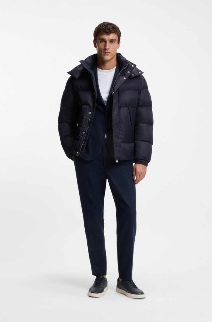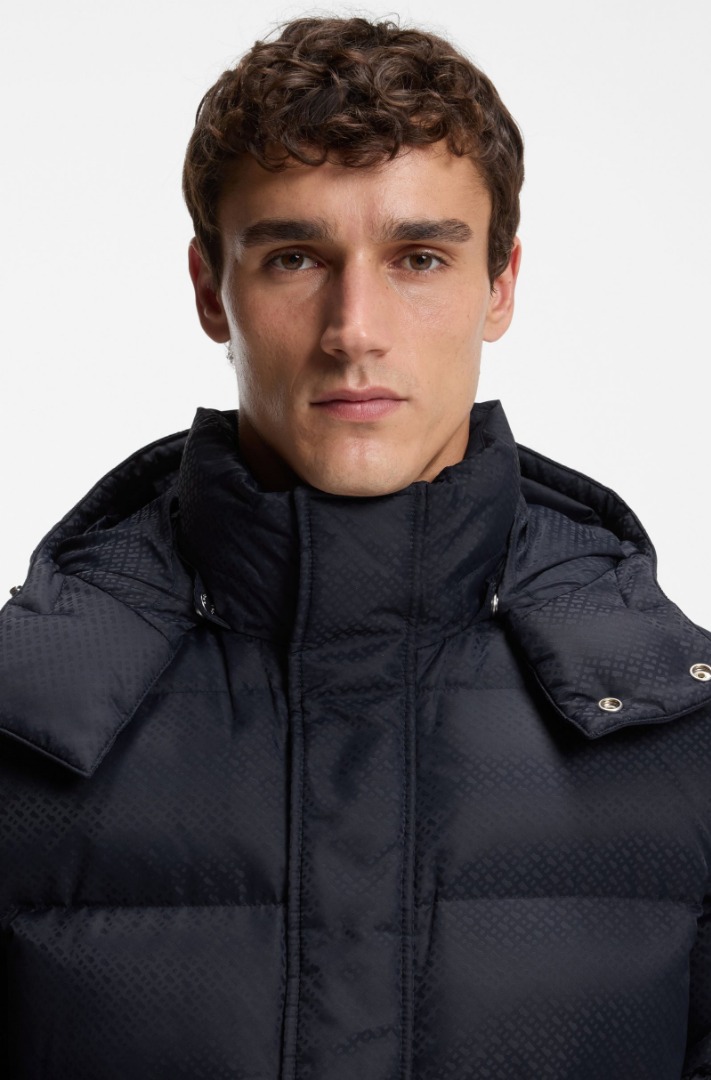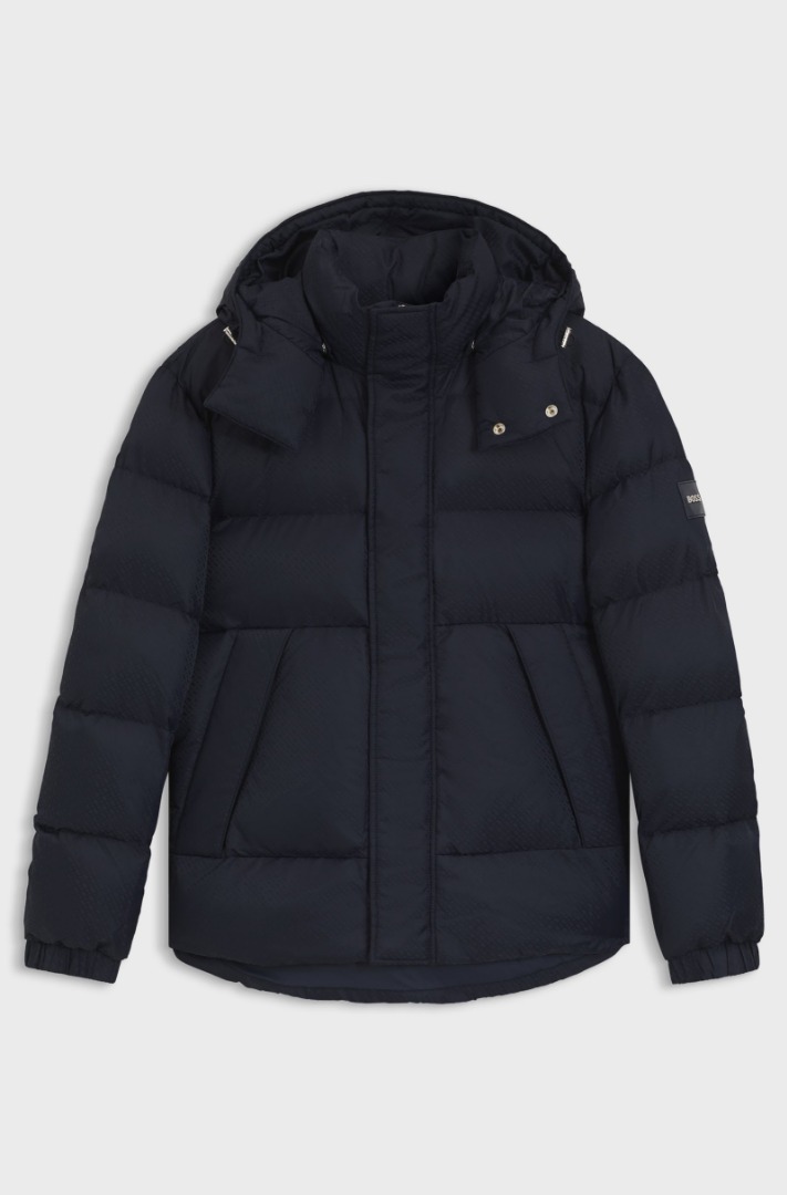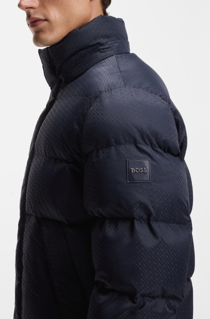 Protective and comfortable, this BOSS Men's jacket is crafted from water-repellent fabric with distinctive micro monograms. It features a logo plaque on the left sleeve. This product contains at least 60% premium raw materials. This product is made partially from recycled polyester. HUGO BOSS prefers to use recycled polyester from pre- and post-consumer textile waste and is actively working to replace polyester derived from PET bottles.