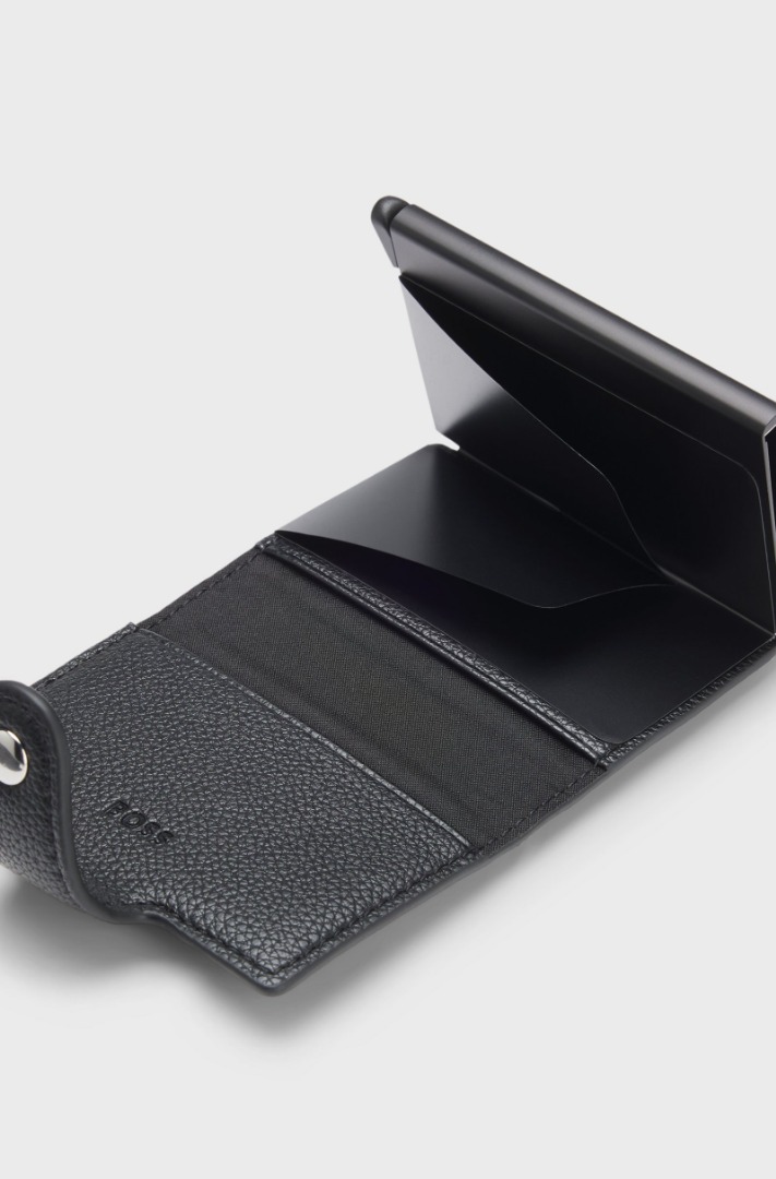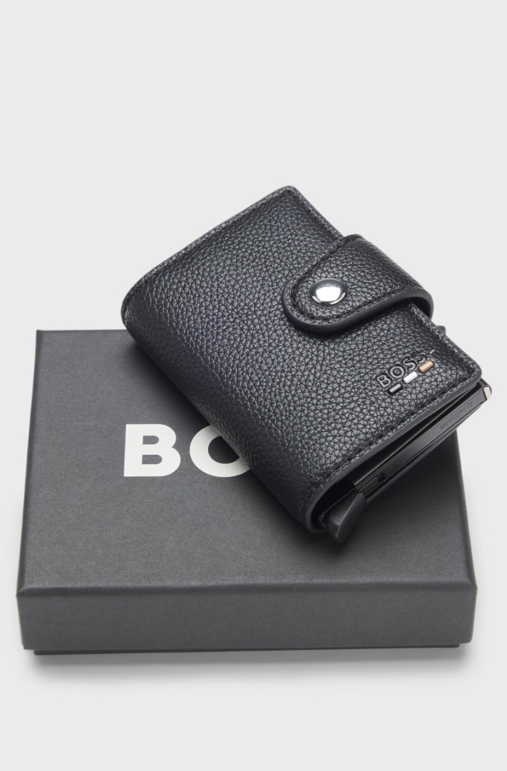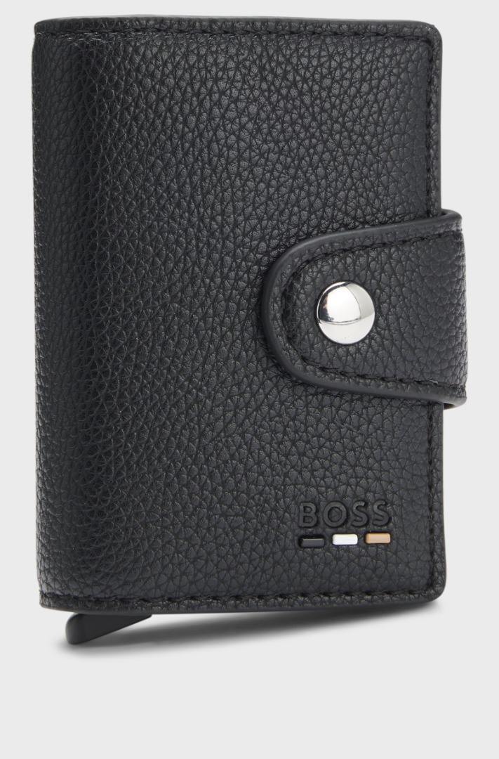 Featuring a snap closure, this BOSS Men's card holder is an innovative accessory for frequent travellers. Crafted from coated synthetic fabric with a hammered finish, this exclusive BOSS card holder features Secrid technology. Its patented system allows for easy access to cards, and the aluminum casing protects against unwanted wireless communications. The coated synthetic fabric, sometimes called faux leather, is designed to resemble genuine leather and features a matte, shiny, smooth, or textured coated effect. Dimensions: 9 x 7 x 1 cm Length: 7.0 cm Width: 1.0 cm Height: 9.0 cm