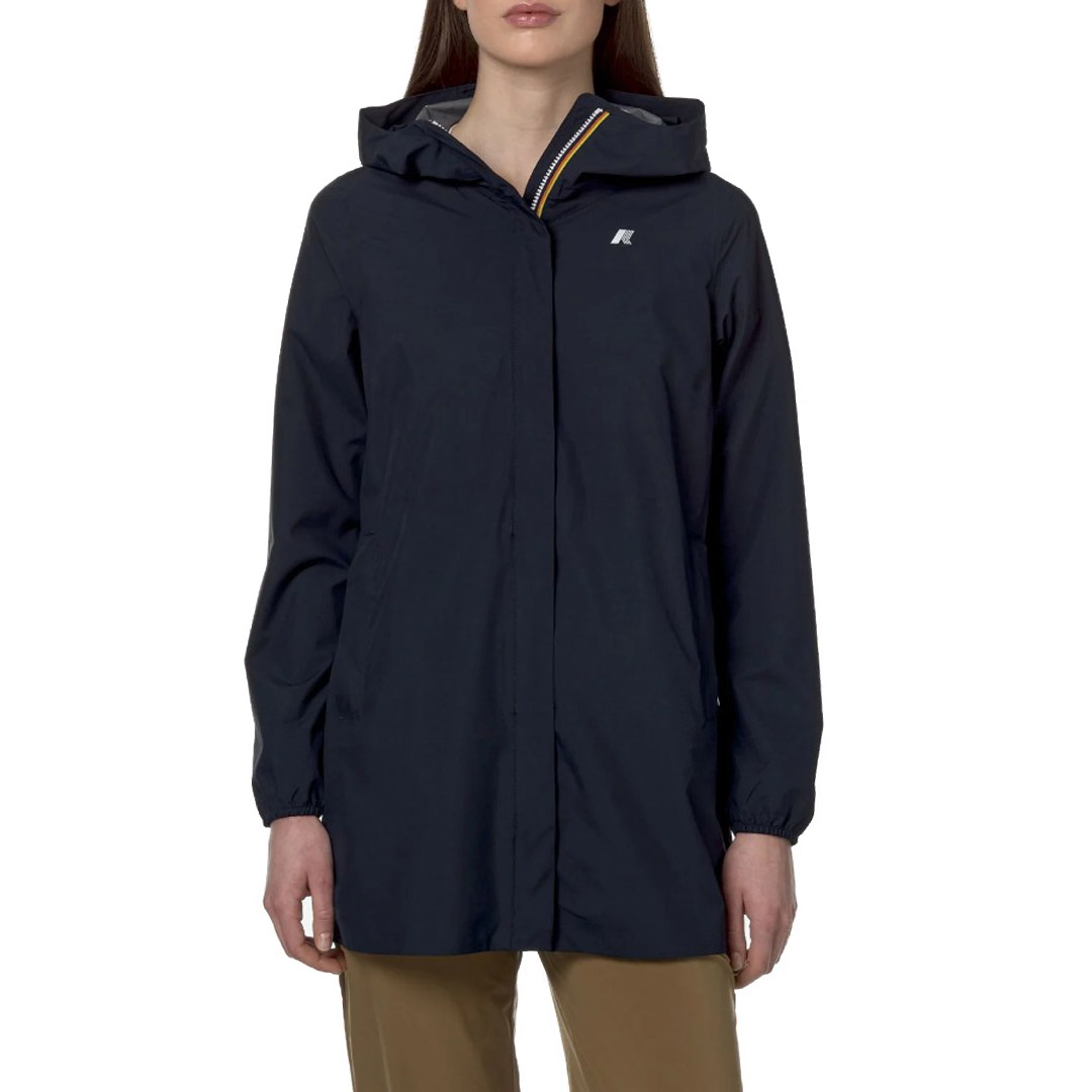 Sophie is a three-quarter length women's jacket with a slim fit, ideal for mid-season, made of stretch and recycled technical fabric, which follows your movements and protects from wind and rain up to 5000 columns of water. The interior is lined with an insulating membrane decorated with all-over K-Way lettering printed in silver tones. The side pockets with zip, the enveloping hood and the cuffs with elastic inserts are functional details that guarantee grip and a comfortable and quick fit. Stretch recycled polyester fabric, waterproof, water-repellent, windproof, breathable Internal membrane printed with logo Heat-taped seams Adjustable hood with elastic cord Zip closure Elastic cuffs 2 zip pockets Regular fit White printed logo