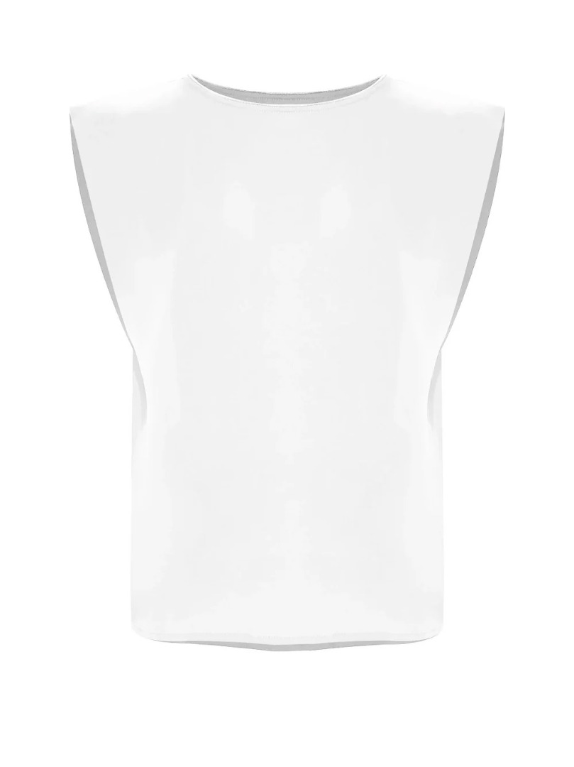Blouse with crossed V-neck and gold pin clasp. Sleeveless.