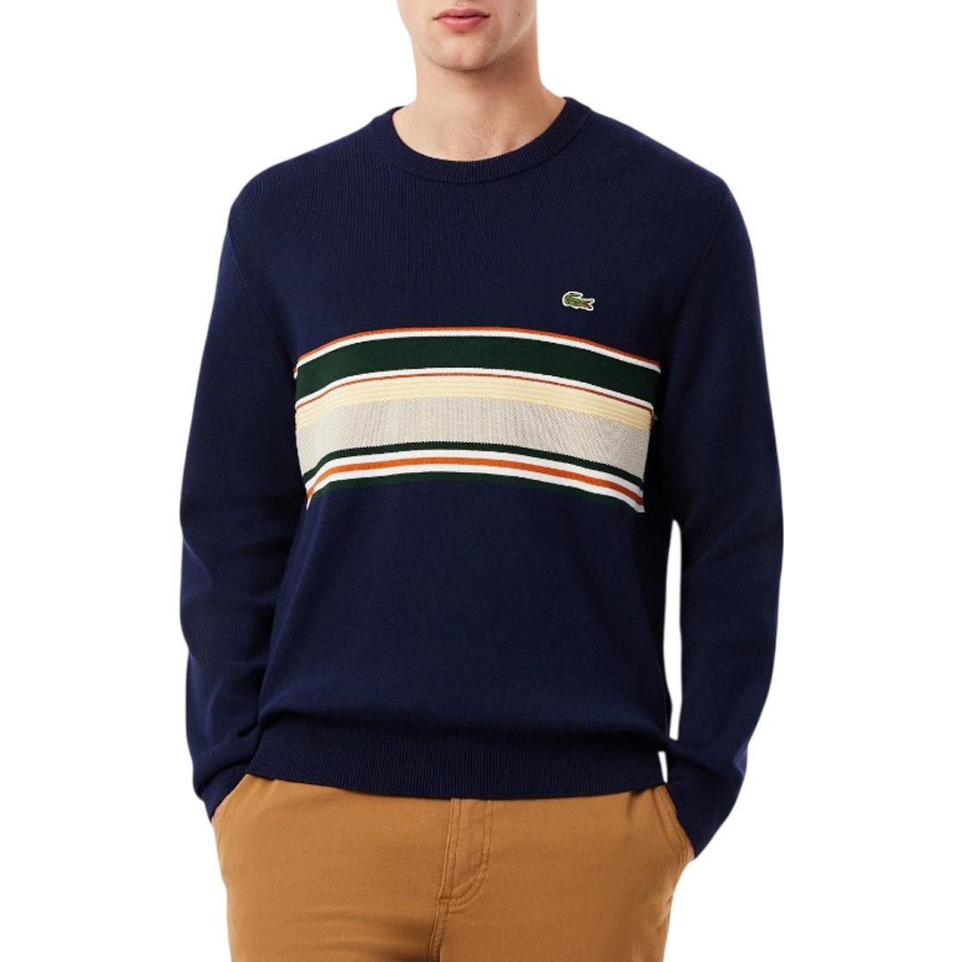 This sweater is the fruit of 90 years of Lacoste expertise in elegance and knitwear. Crafted in the historic Lacoste factories in Troyes, France, it features contrasting center stripes, created with subtle knit details for a sophisticated textured effect. A must-have with ribbed finishing details and a traditional embroidered crocodile. Blend of organic cotton and wool from animal-friendly sources. Classic fit, comfortable sleeves. Medium-weight 12-gauge knit. Textured contrast center stripes. Ribbing on the collar, cuffs, and hem. Embroidered crocodile on the chest.