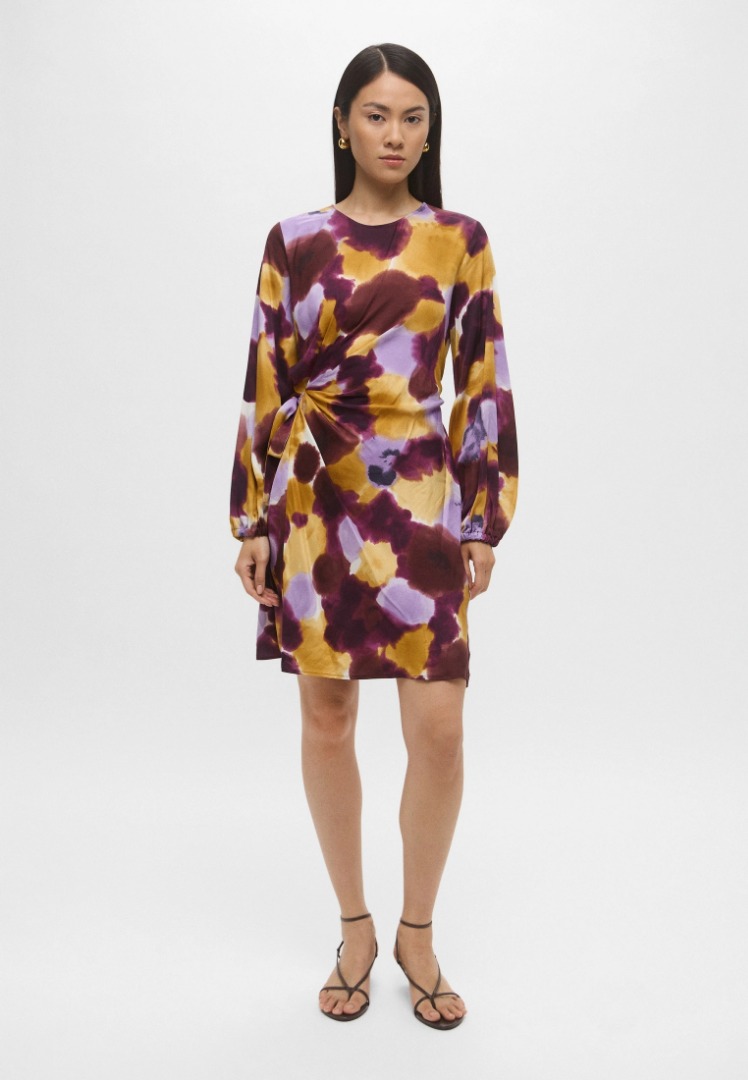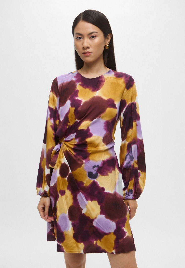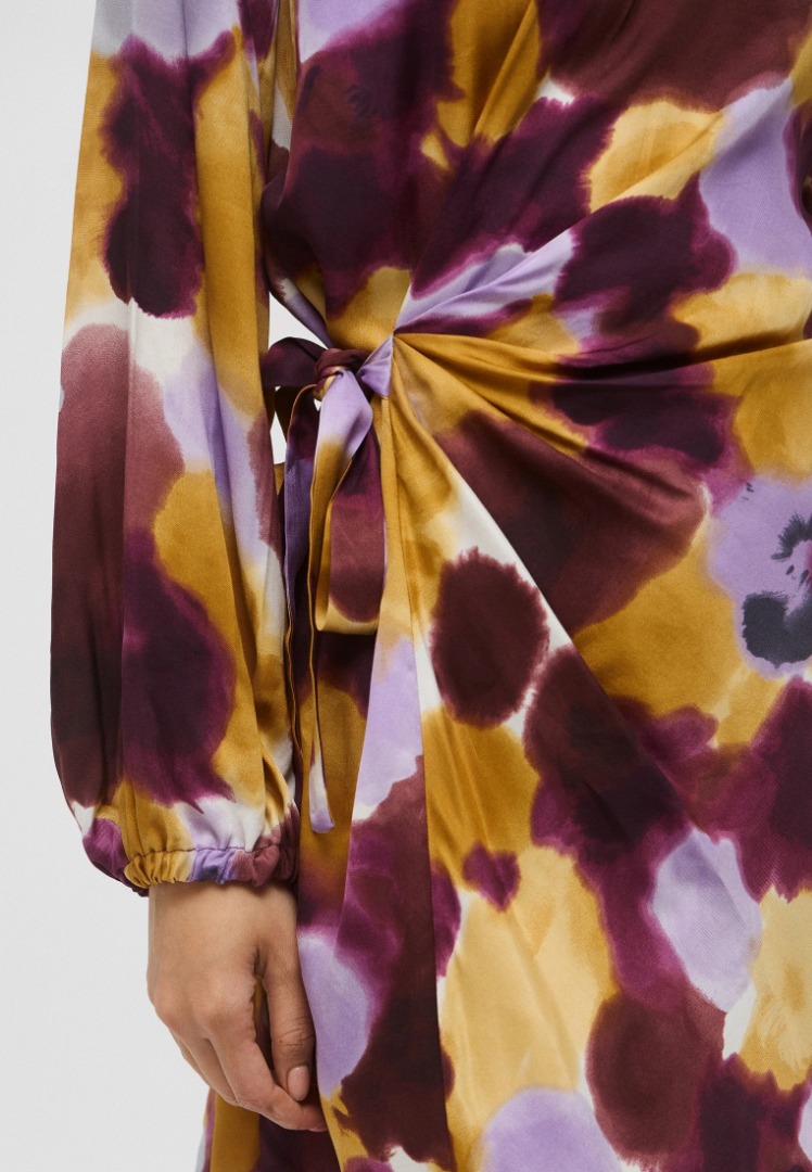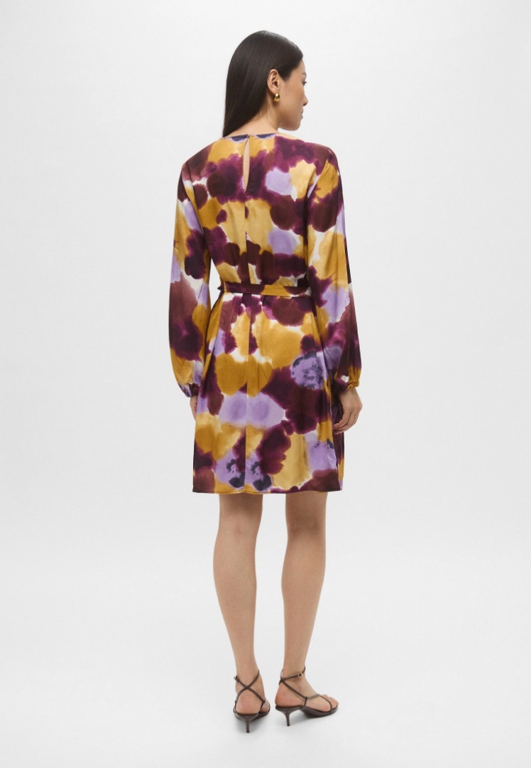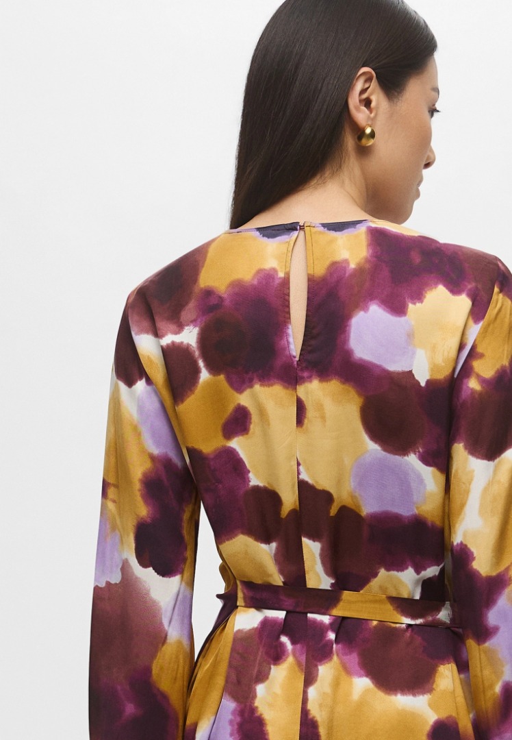 A new take on the wrap dress, featuring a sash that ties at the side and defines the silhouette. Above-the-knee length. Printed viscose twill dress. Feminine fit, tapered at the waist. Crew neck with a keyhole back. Long sleeves with gathered detail and elasticated cuffs. Full skirt with a side-tie sash.