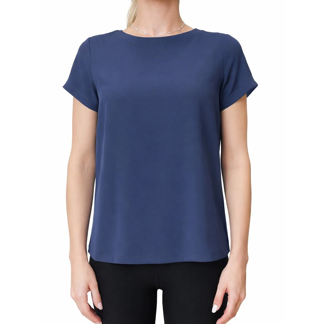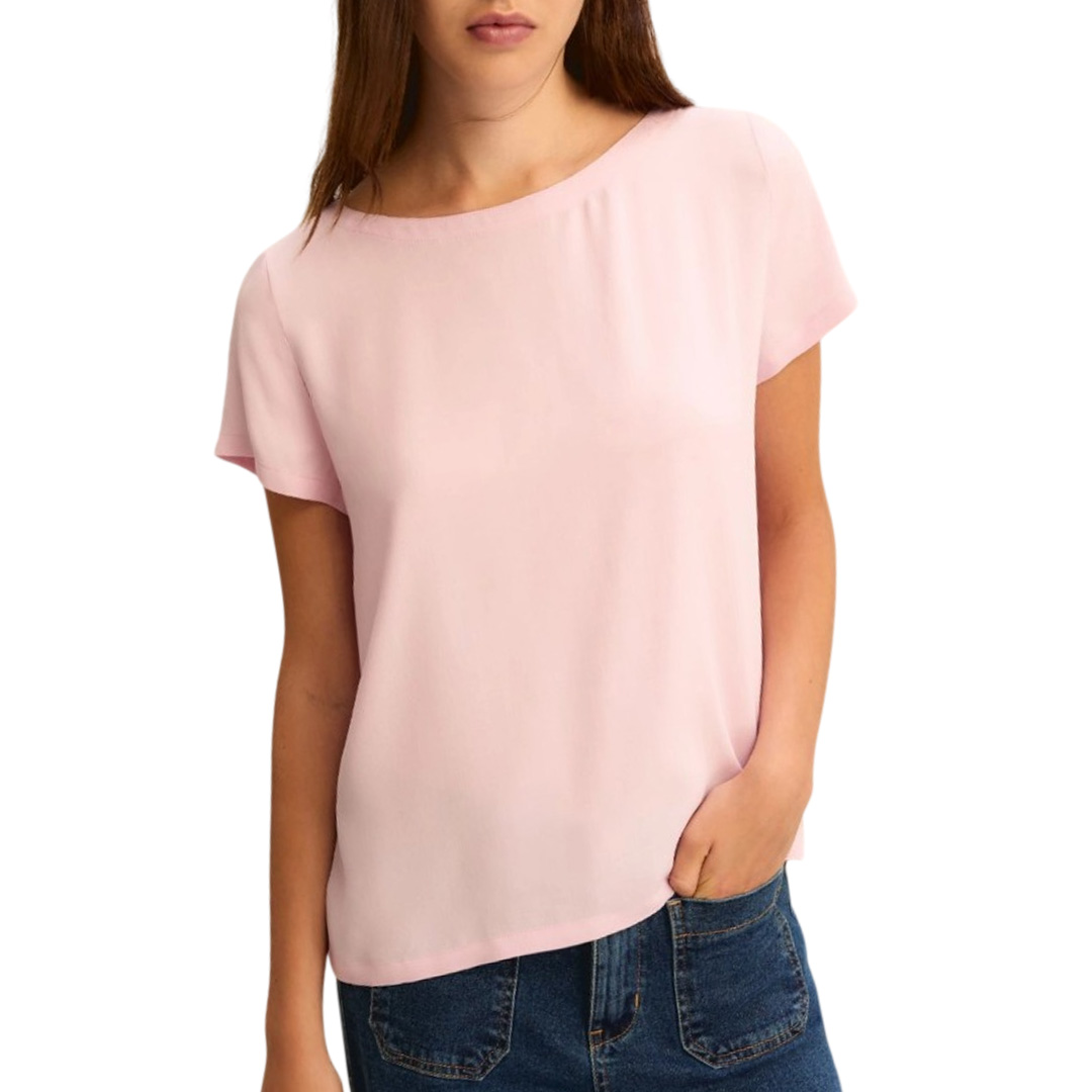 Versatile and elegant blouse in silk-blend crêpe de Chine for a luxurious touch on the skin. With short sleeves and a boat neck inspired by 1980s sailor blouses. Main fabric containing raw materials derived from wood cellulose, a fiber obtained in compliance with forestry heritage. Silk-blend crêpe de Chine blouse. Regular fit. Boat neck. Short sleeves.