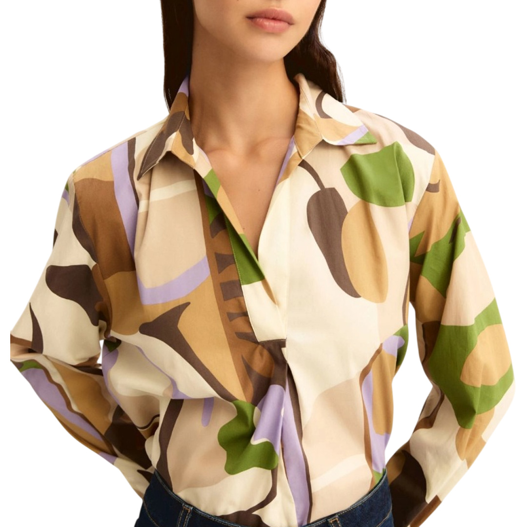An informal alternative to the shirt, the polo-neck blouse is made of pure cotton poplin decorated with a multicolor print. It features side slits and a back yoke for a customizable style. Printed cotton poplin blouse Regular fit Pleated polo neck Long sleeves with cuffs Side slits Back yoke