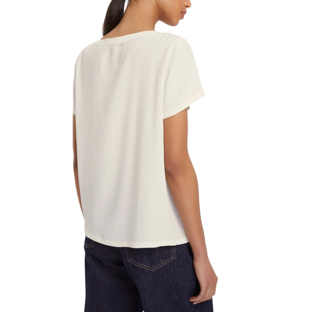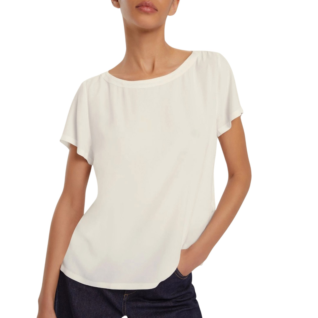 Simple lines and a luxurious silk blend crêpe de Chine make this blouse a true seasonal staple. Pair it with a blazer or tailored pants for a fresh city look, or with your favorite denim for more social moments. Silk blend crêpe de Chine blouse. Straight and relaxed fit. Round neck. Short sleeves.