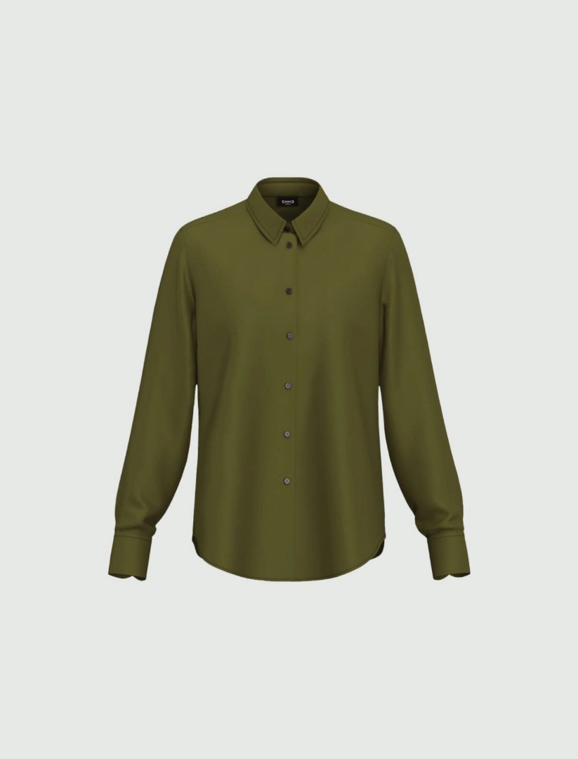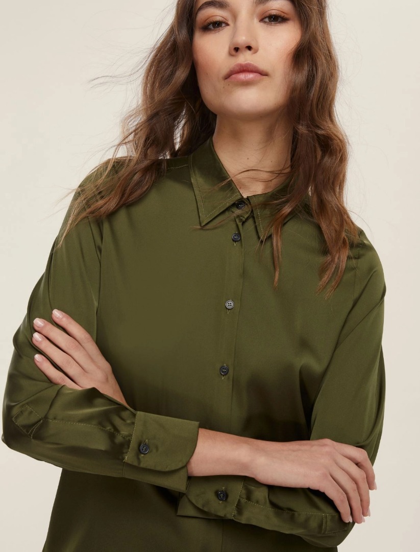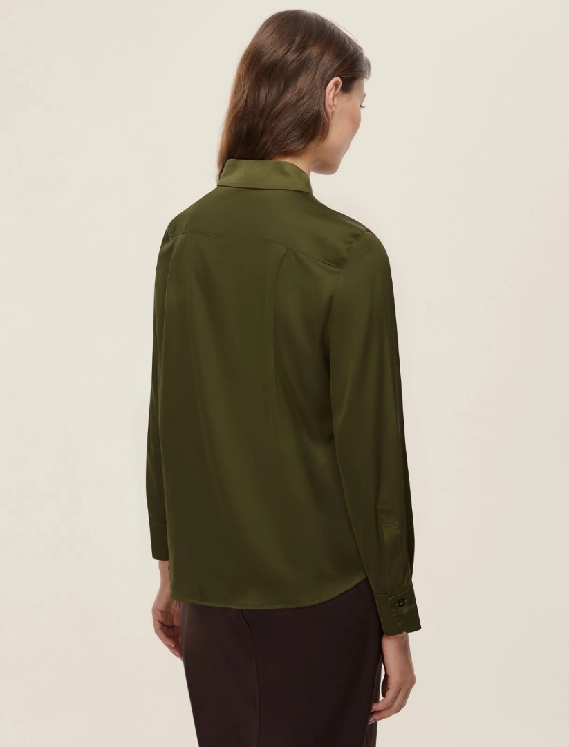 Versatile and always perfect, this lightweight satin shirt will take you through your days with all the elegance of timeless pieces. Wear it chicly with a coat and pencil skirt, or simply with denim. Lightweight stretch satin shirt. Feminine fit. Slightly tailored. Shirt collar and button closure. Long sleeves with buttoned cuffs. Back yoke with double pleats.