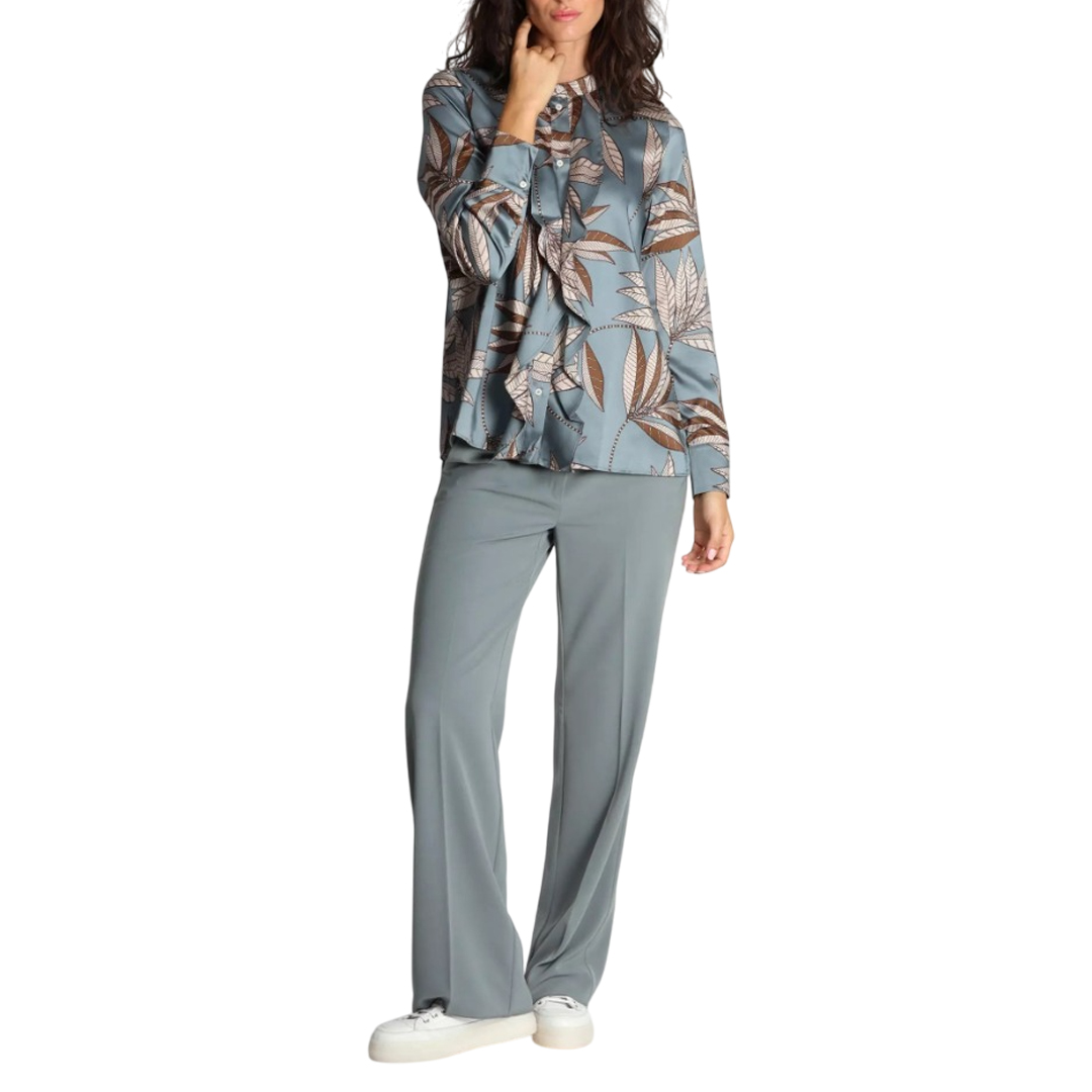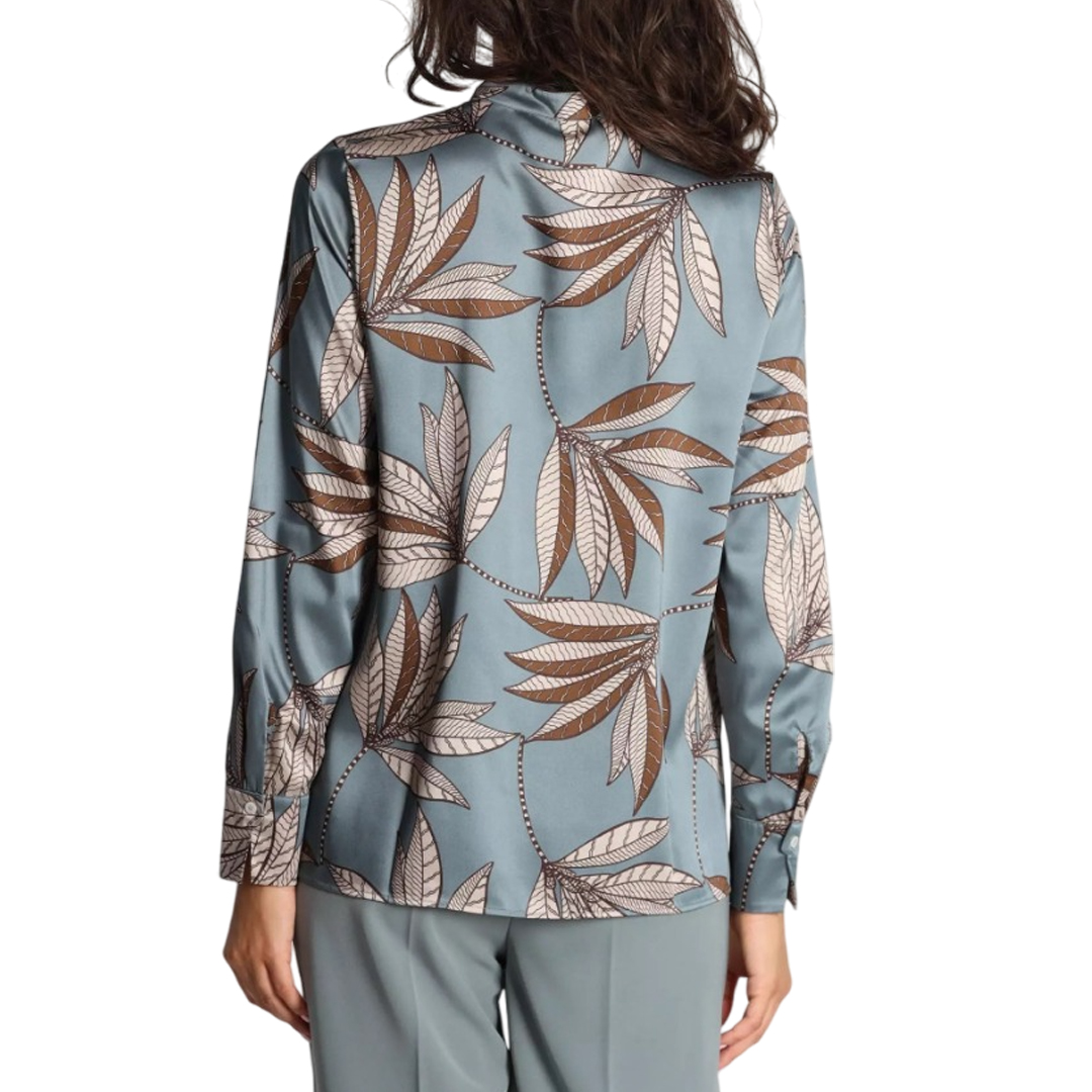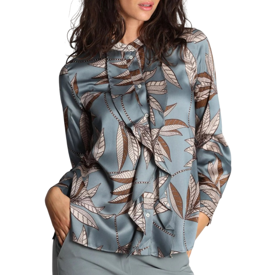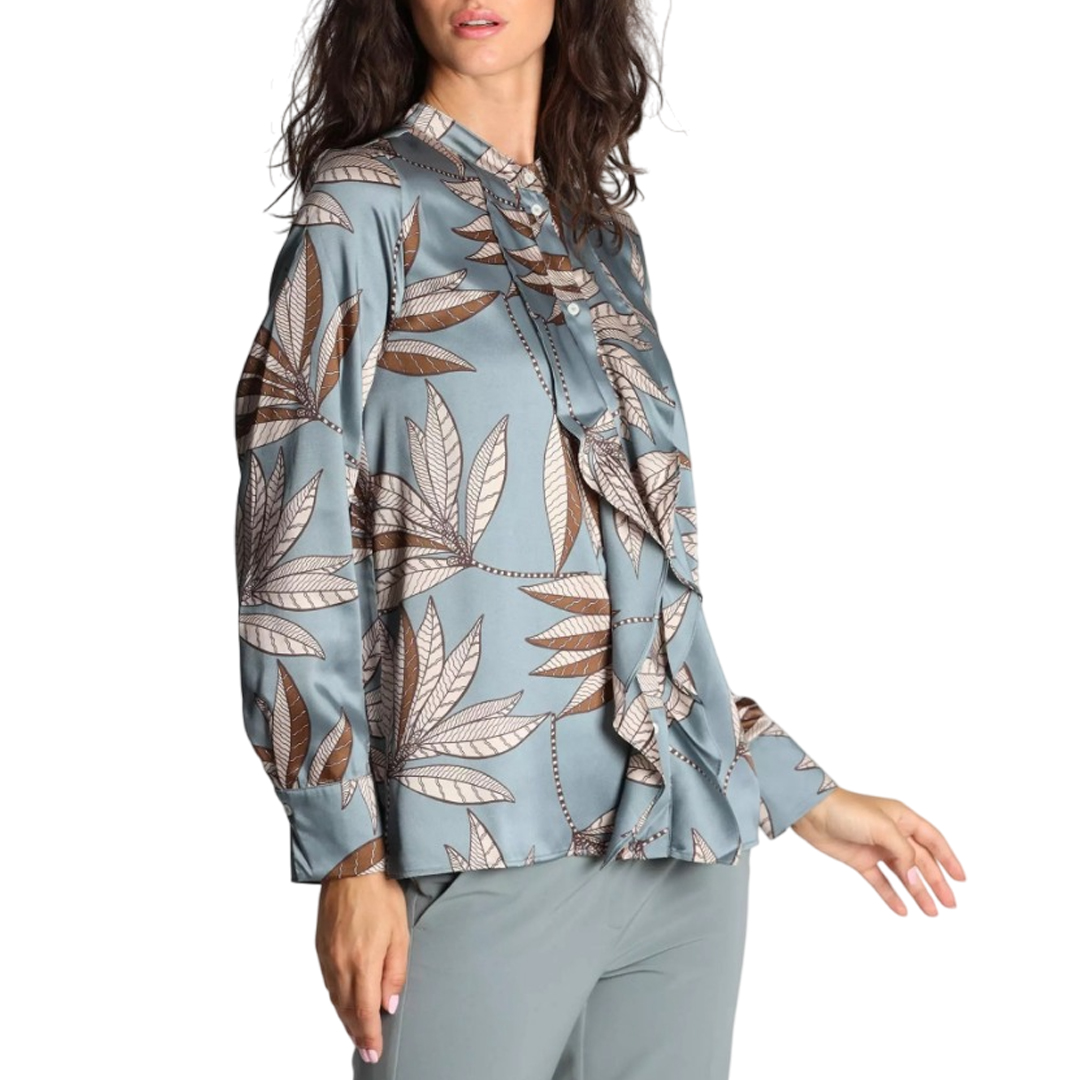 Large foliage and the romantic touch of ruffles on the front transform this shirt into a new seasonal must-have. Perfect under a raincoat and with denim. Main fabric containing over 50% recycled polyester. Shirt in printed technical fabric. Straight fit. Mandarin collar with exposed button placket. Small ruffles on the front. Cuff with button and small puff.