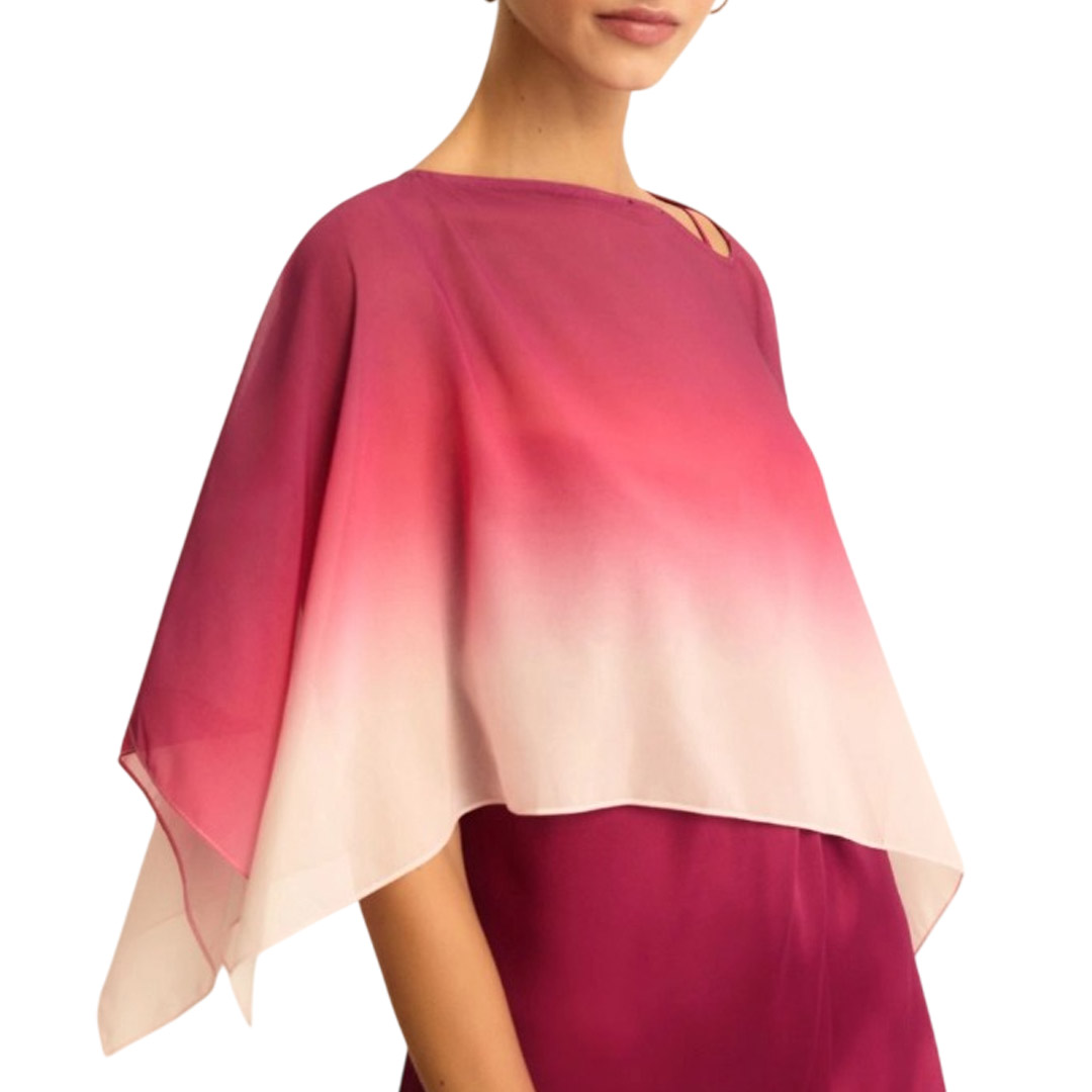 The natural elegance of georgette, the sophisticated construction with an open neckline. The new cape is designed to elegantly complete your most important outfits, from special evenings to ceremonies. Georgette crepe cape. Rectangular silhouette with an asymmetrical neckline. Dégradé pattern.
