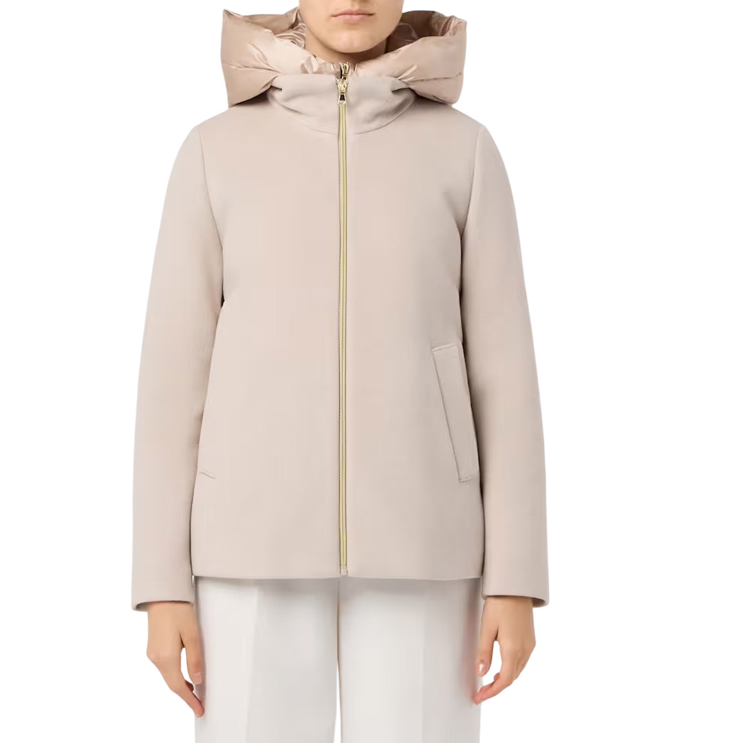 Compact and transformable, this soft cloth jacket combines functionality and urban style. The rainproof bib and hood can be removed, revealing a more streamlined design. Short padded soft cloth jacket. Straight fit. Collar with detachable hood and bib in luxury rainproof fabric. Full zip closure. Side welt pockets.