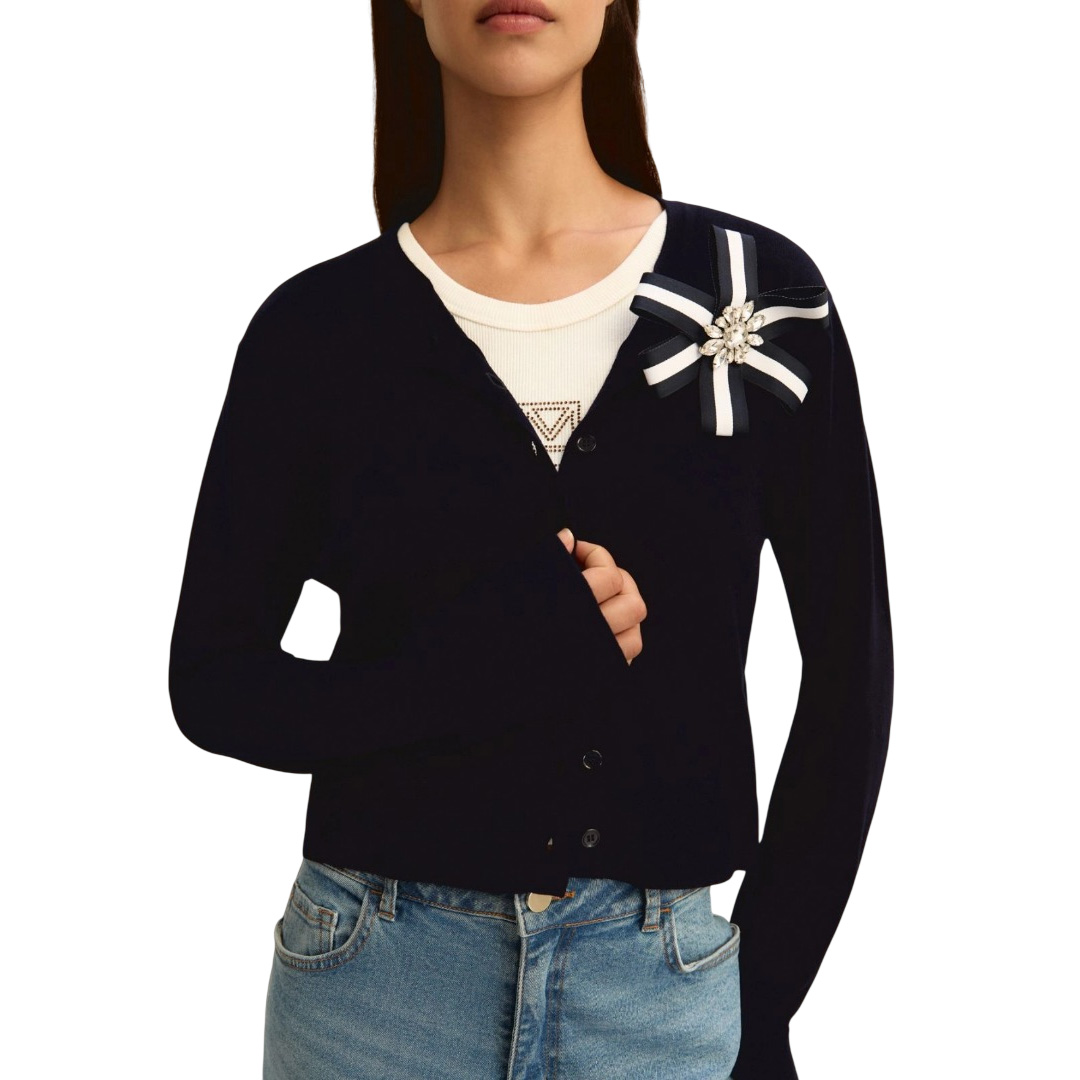 The most versatile and bon ton piece of the season is this stretch cardigan, with a feminine line and a small cockade-shaped jewel pin. Award-winning for its style! Stretch viscose blend cardigan. Regular fit. Round neck. Exposed button closure. Removable cockade pin with jewel. Ribbed hem and cuffs.