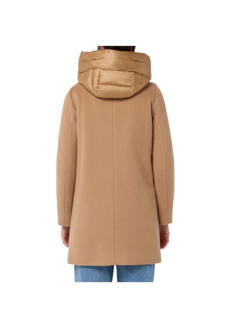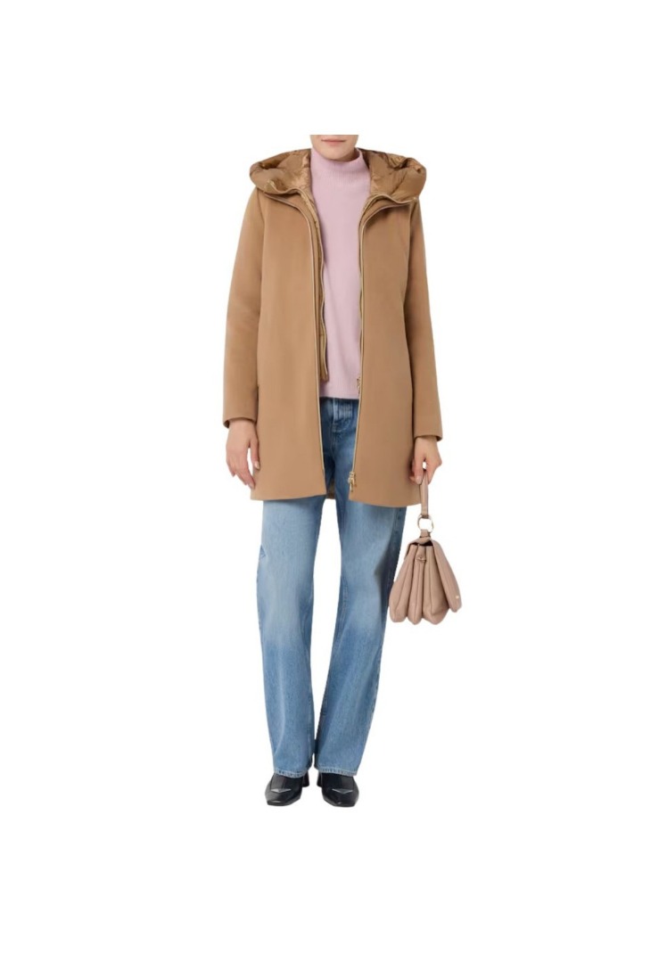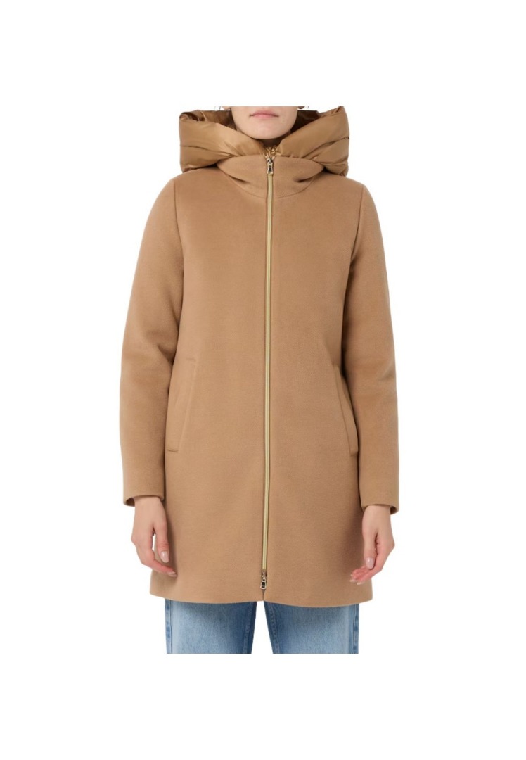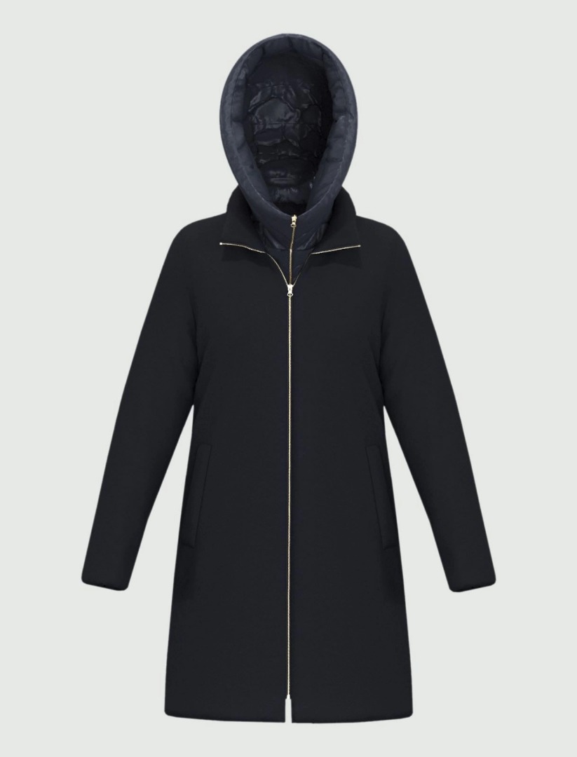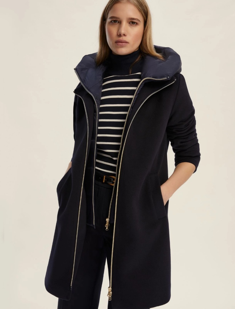 Versatile and refined, this soft cloth jacket combines the softness of the fabric with the warmth of the padding. The water-repellent treatment and removable bib play with styling, ensuring protection even on the coldest of winter days. Padded soft cloth jacket. Straight fit. Removable hood and bib in luxury, water-repellent, padded fabric. Concealed internal zip closure and visible external zip. Welt pockets.