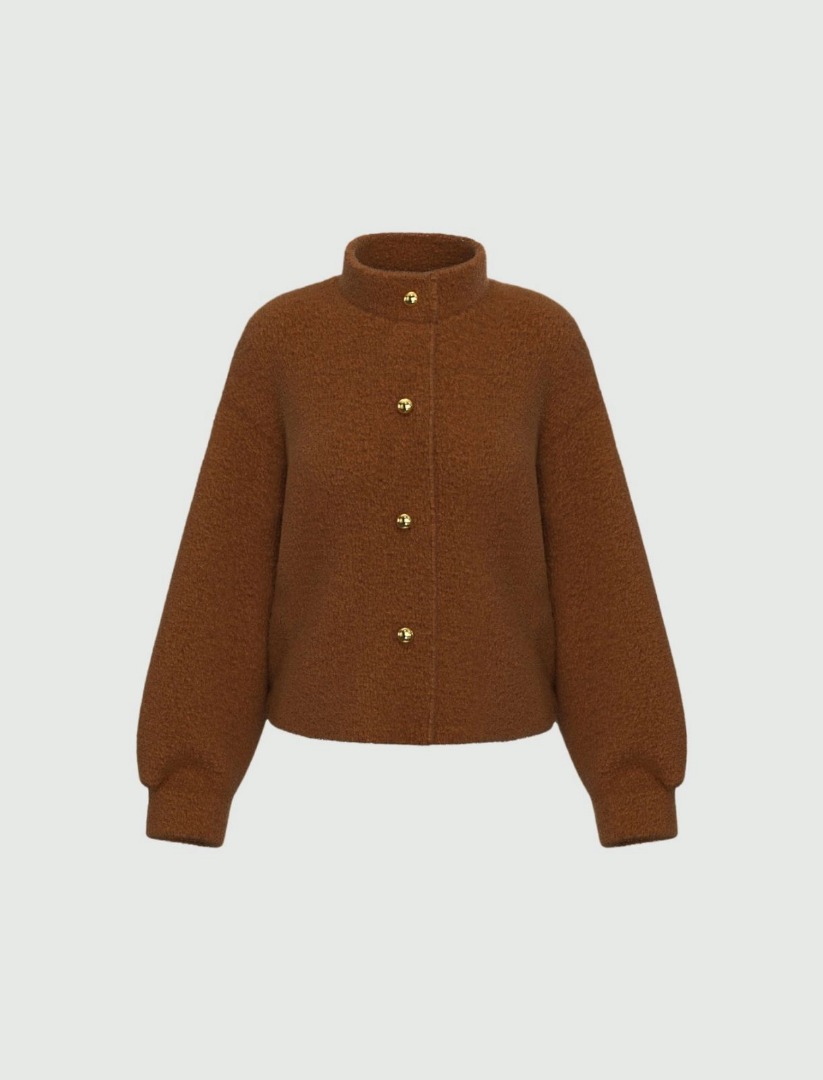 A glamorous choice to wear over and over again, this reversible bomber jacket features one side in furry knit and the other in smooth, soft fabric. Play with style and choose what you will be today. Reversible bomber jacket with one side in fluffy knit and the other in smooth, soft fabric. Relaxed fit. Stand-up collar. Horn-effect button closure on the outside. Inset side pockets. Elasticated insert at the bottom.