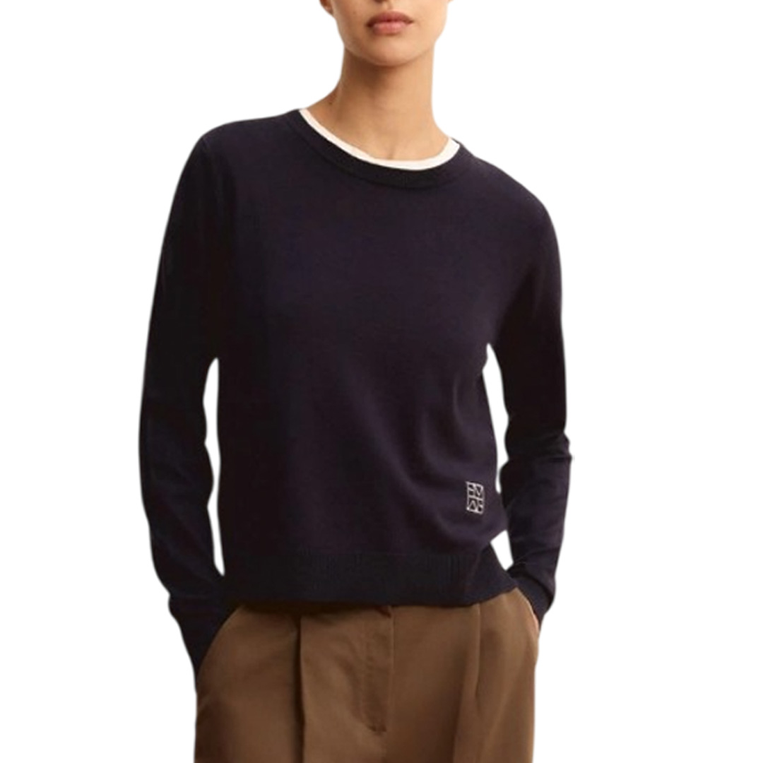 The most special basic in the collection? This crew neck sweater in stretch viscose, with clean lines and the personalized touch of embroidery at the bottom. Stretch viscose blend sweater Regular fit Crew neck Contrasting monogram embroidery motif Ribbed bottom and cuffs