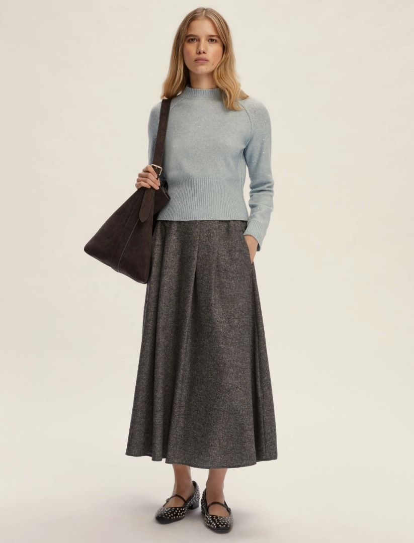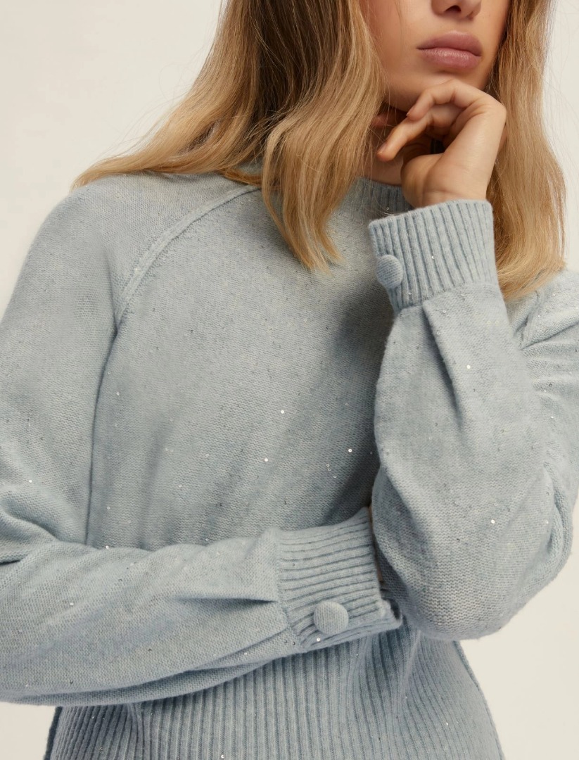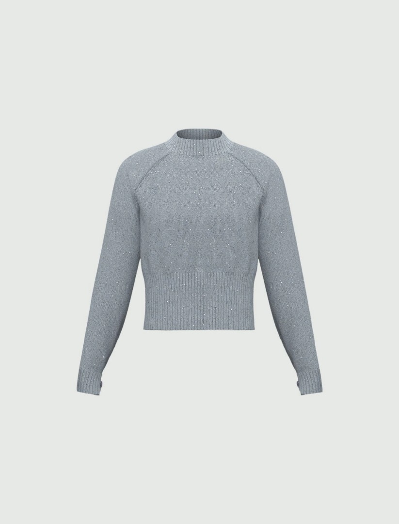 This cropped sweater in comfy yarn is adorned with sequins for a luminous yet subtle effect. The funnel neck and external seams define its character, while the button at the cuff adds a sophisticated detail. Wear with high-waisted denim or flowing skirts for an unexpected balance. Comfy yarn sweater with sequins. Cropped fit. Funnel neck with raglan sleeves. External seams on the shoulder and sides. Wide ribbed hem with button at the cuff.