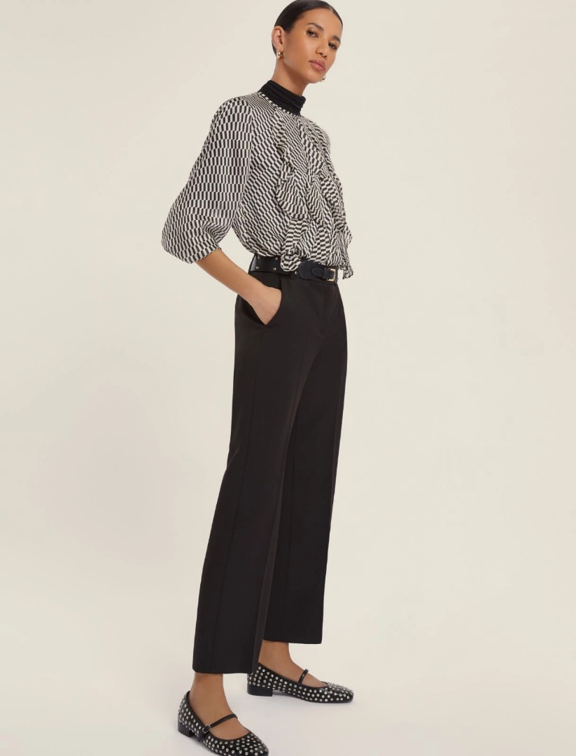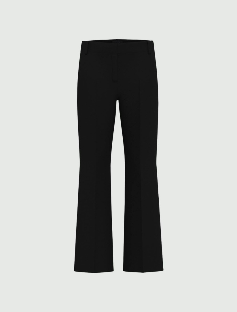 A true must-have for the contemporary wardrobe, the slim flare trousers slim the silhouette and offer you all the versatility you seek. From the office to informal evenings. Technical bi-stretch diagonal trousers. Slim fit with flared hem. Hook-and-eye closure and hidden zip. Belt with belt loops. Side French pockets. Ironed crease on front and back.