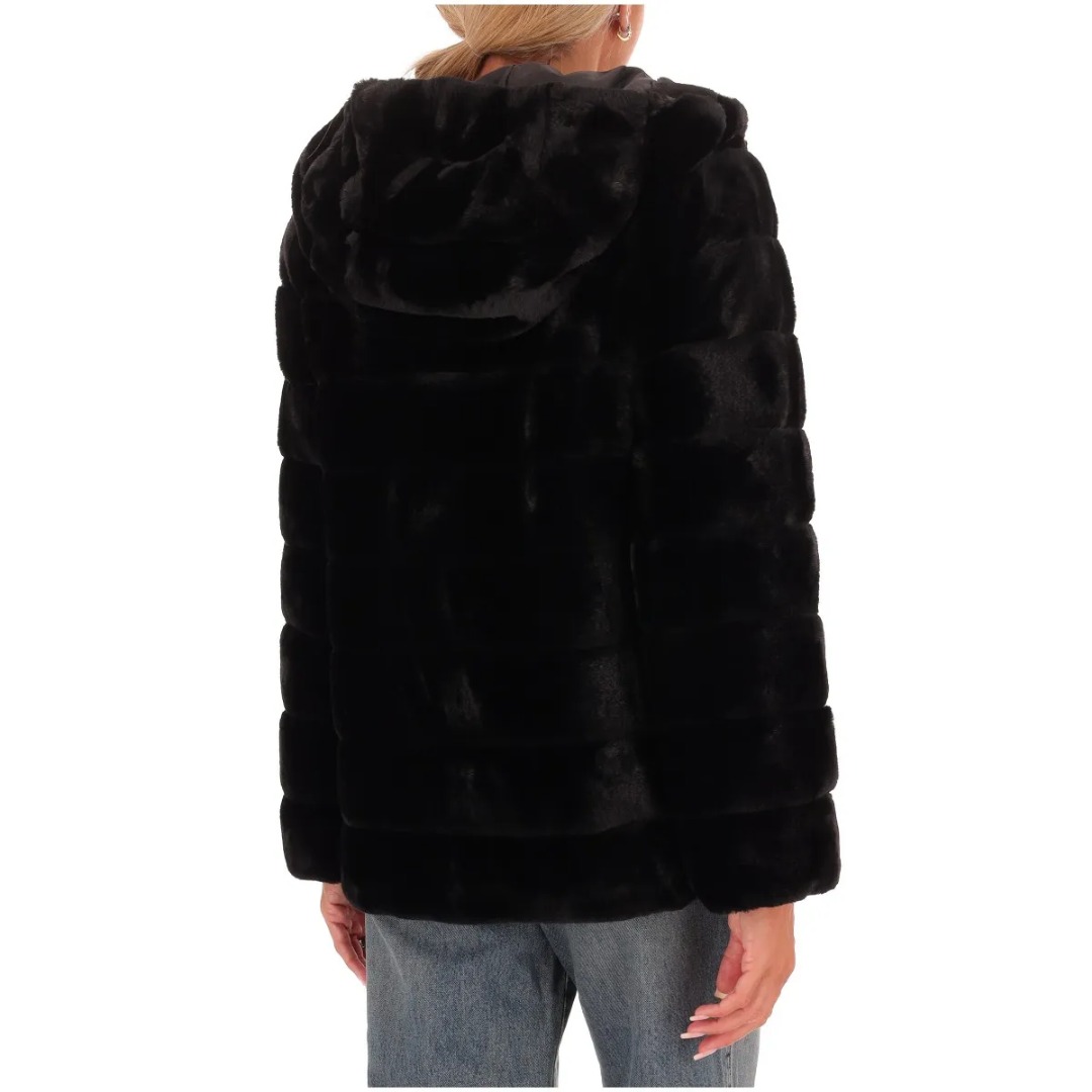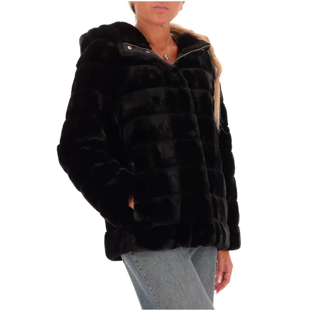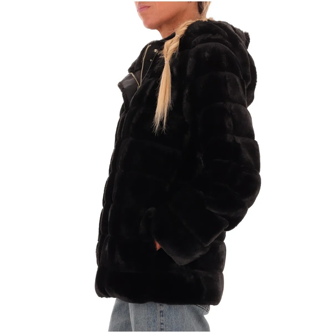 Black faux fur coat with hood. Zip and snap button closure. Side pockets. Eco-friendly padding. Lined.