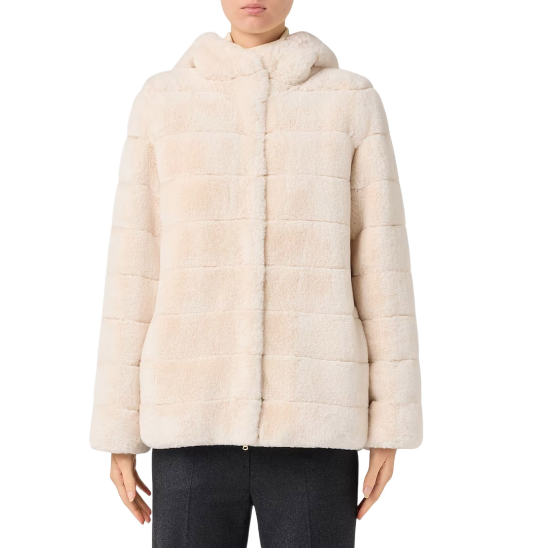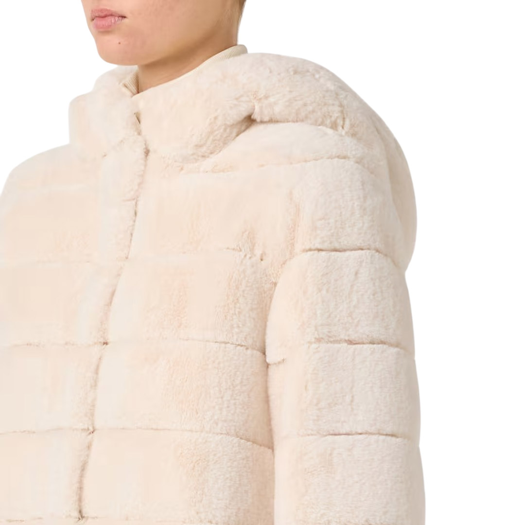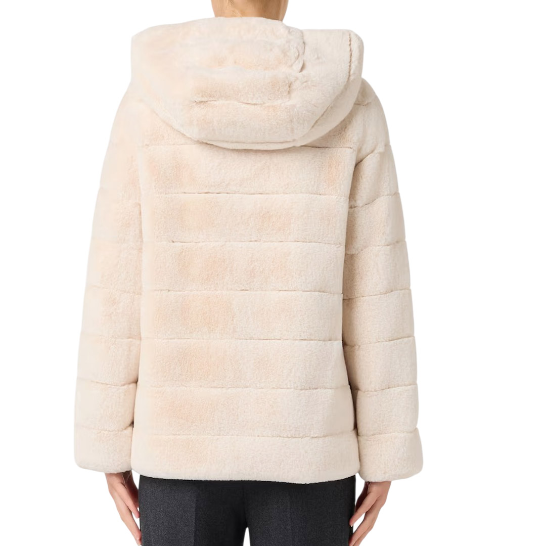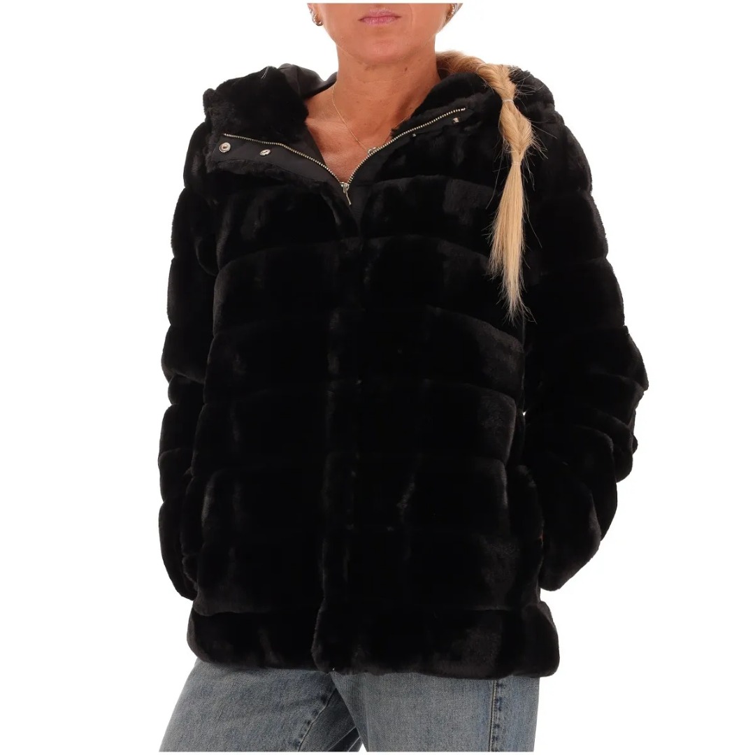 Black faux fur coat with hood. Zip and snap button closure. Side pockets. Eco-friendly padding. Lined.