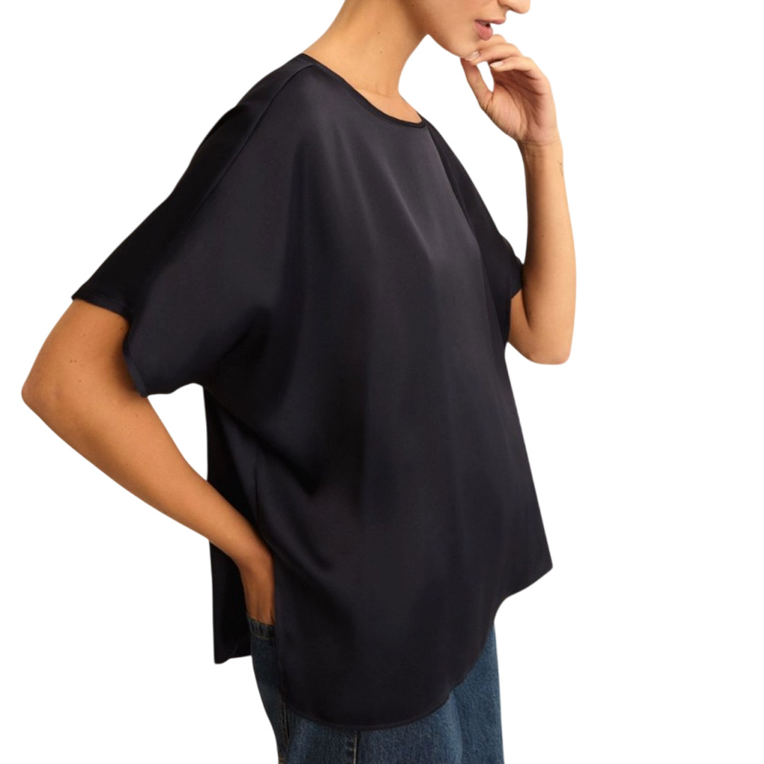 The elegance of satin, the cool lines of a t-shirt: it's impossible to resist the versatility of this new top, with kimono sleeves and raw-edge details. Satin t-shirt. Loose fit. Boat neck. Short sleeves with a kimono line and raw-edge details. Side slits.