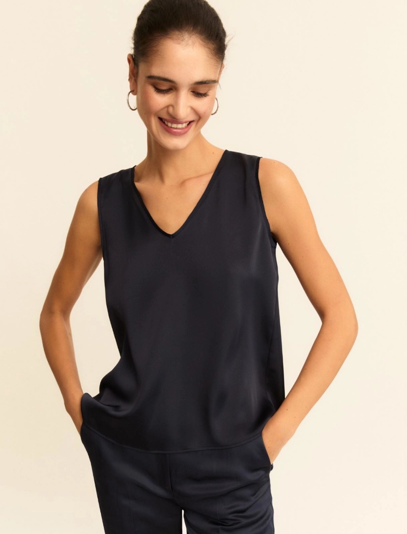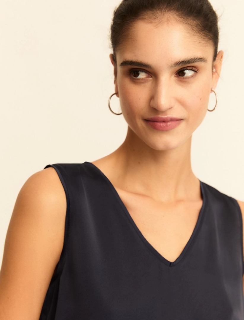 An elegant top with a soft V-neck and a shimmering satin finish. Georgette details on the edges add a sophisticated touch. Technical satin top. Regular fit. V-neck. Sleeveless. Georgette details on the neckline and armholes.