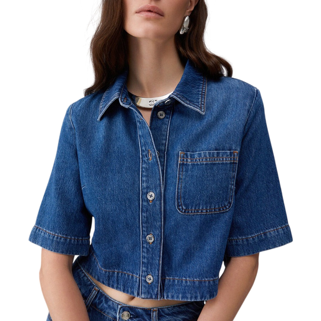 Boxy denim shirt Short sleeves Applied print Front button closure Logo patch applied on the back