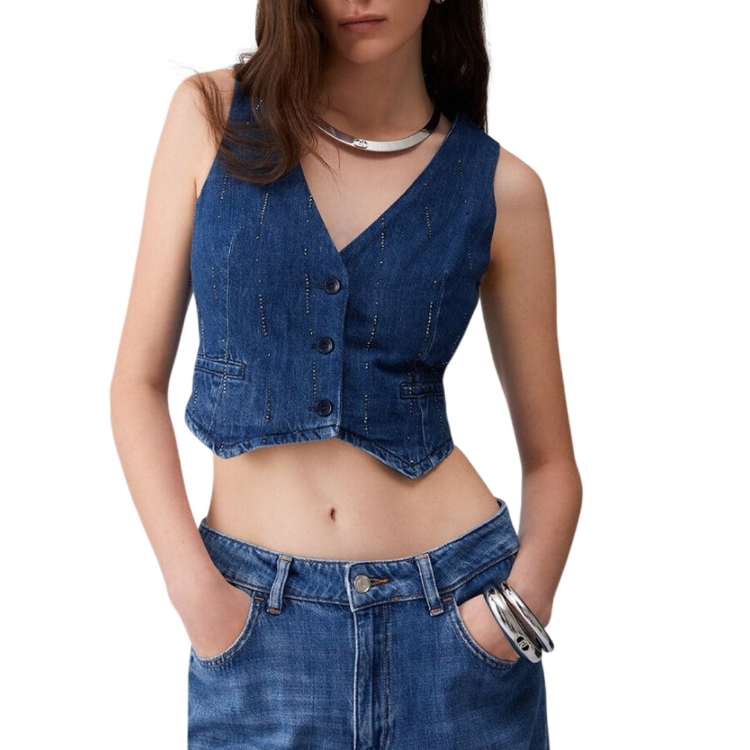 Denim, but with a luminous twist: this vest lights up with micro rhinestones and sculpts the silhouette with a contemporary attitude. Wear it next to your skin or over a shirt, it transforms even the simplest look into a spotlight. Denim vest. Linen and cotton yarns. V-neck. Rhinestone appliqués. Button closure. Welt pockets. Cut-out on the back.