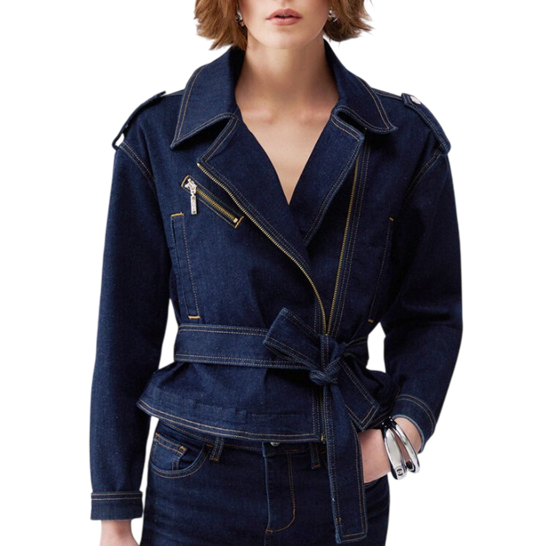 Sharp cut, dark wash, tone-on-tone belt that accentuates the waist and makes it more feminine without losing character: this denim biker jacket instantly energizes the look. Stretch denim jacket Biker style Convenient pockets Belt in tone-on-tone color