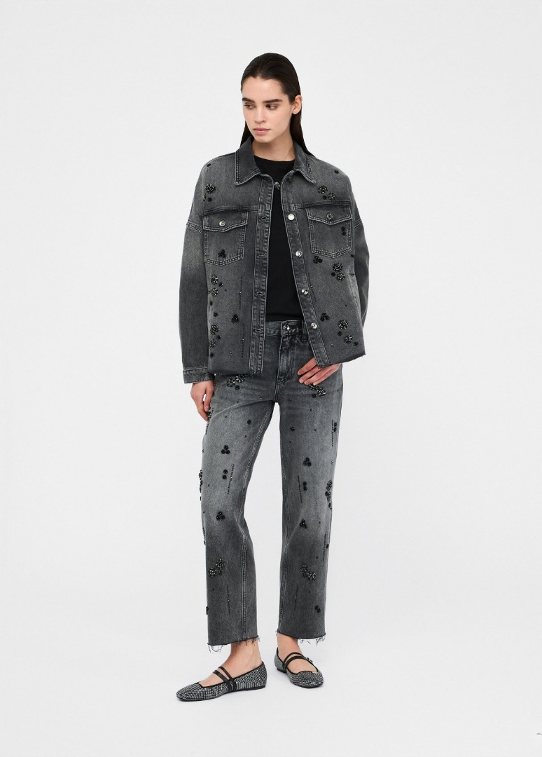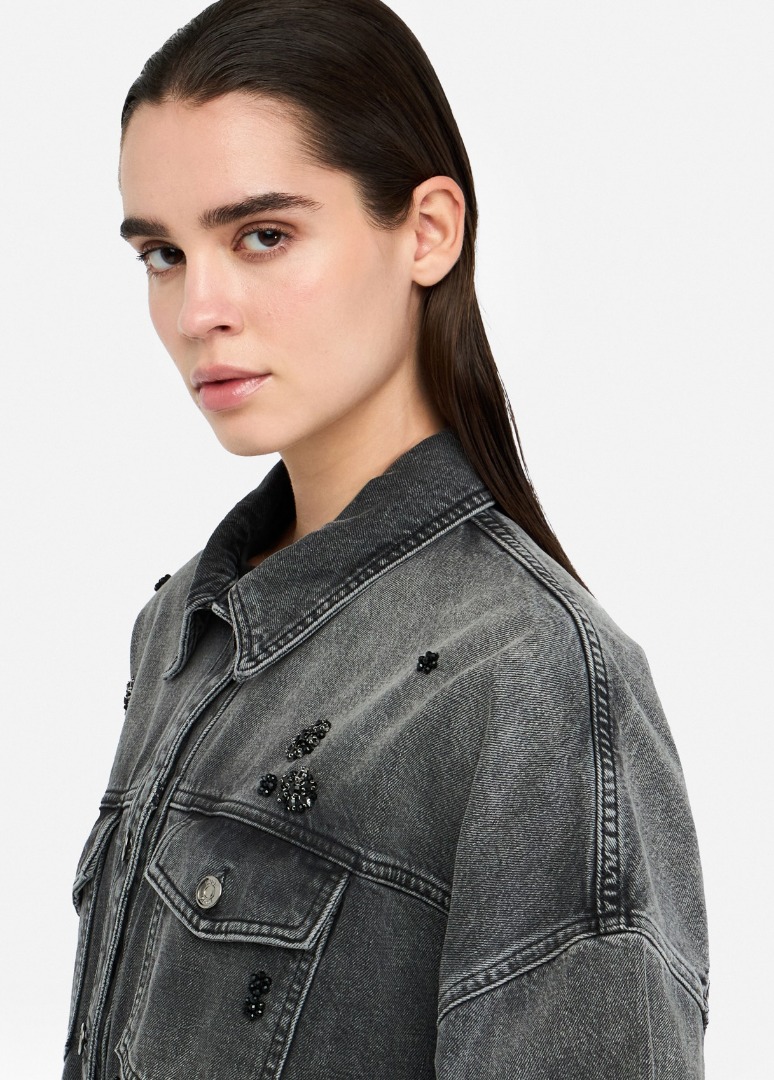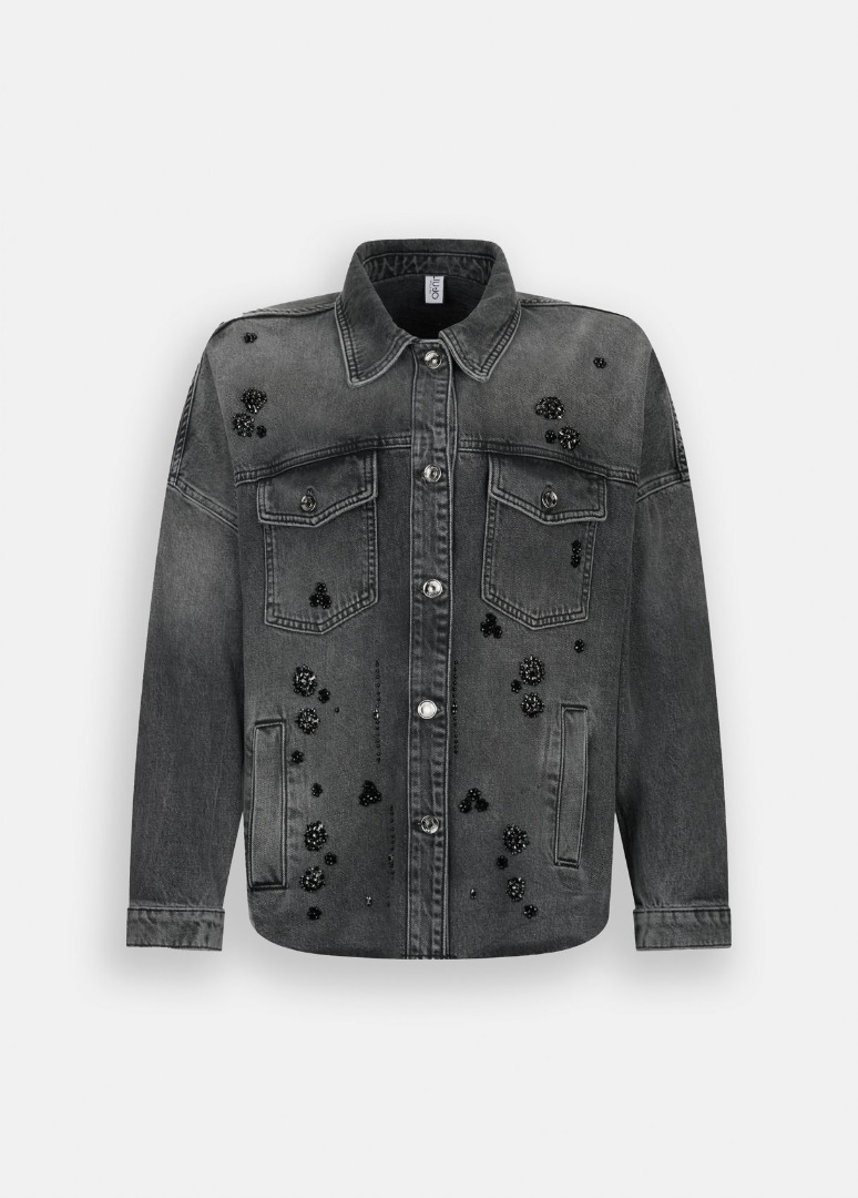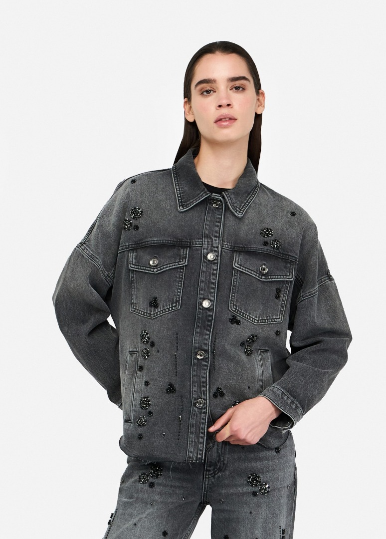 Cotton denim jacket Used wash Rhinestone appliques Shirt collar Pockets with flap and button Side pockets Long sleeves Cuffs with button Frayed hem Logo patch on the back Button fastening
