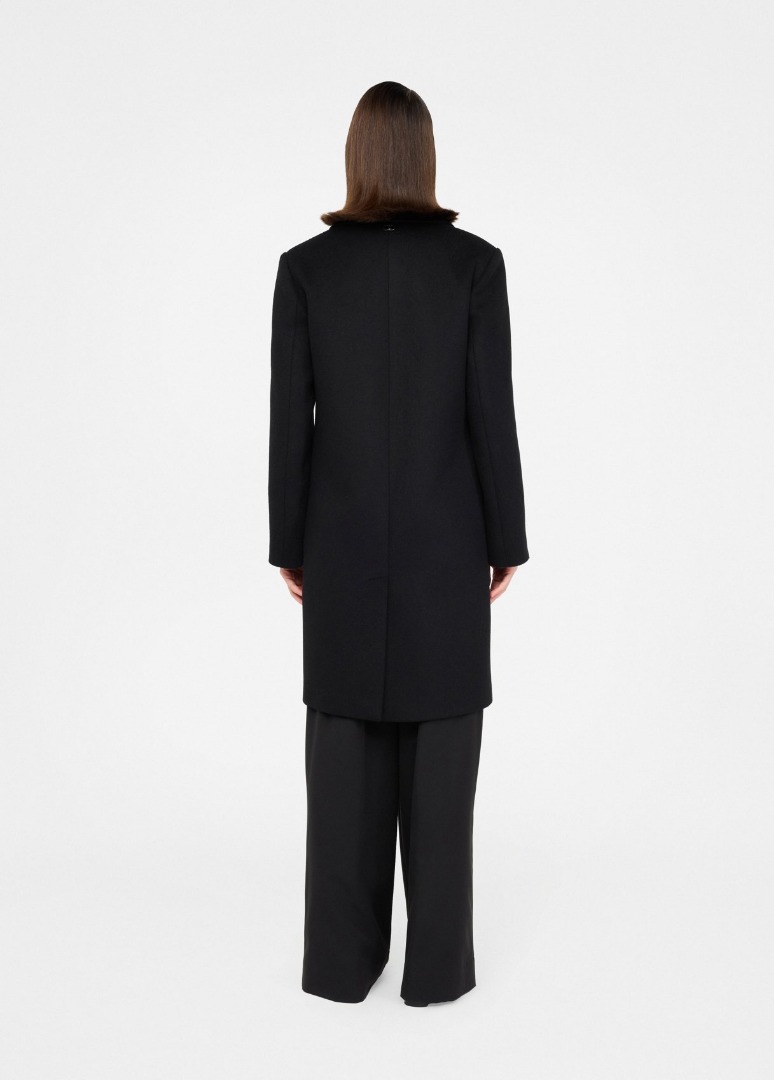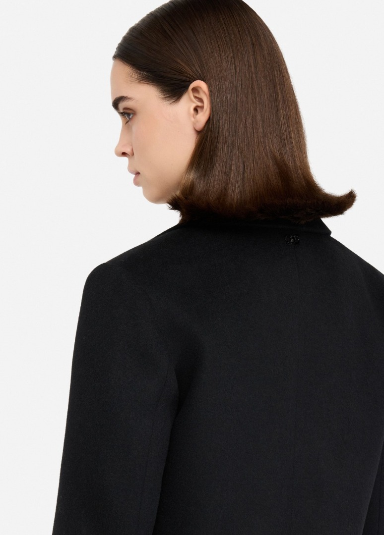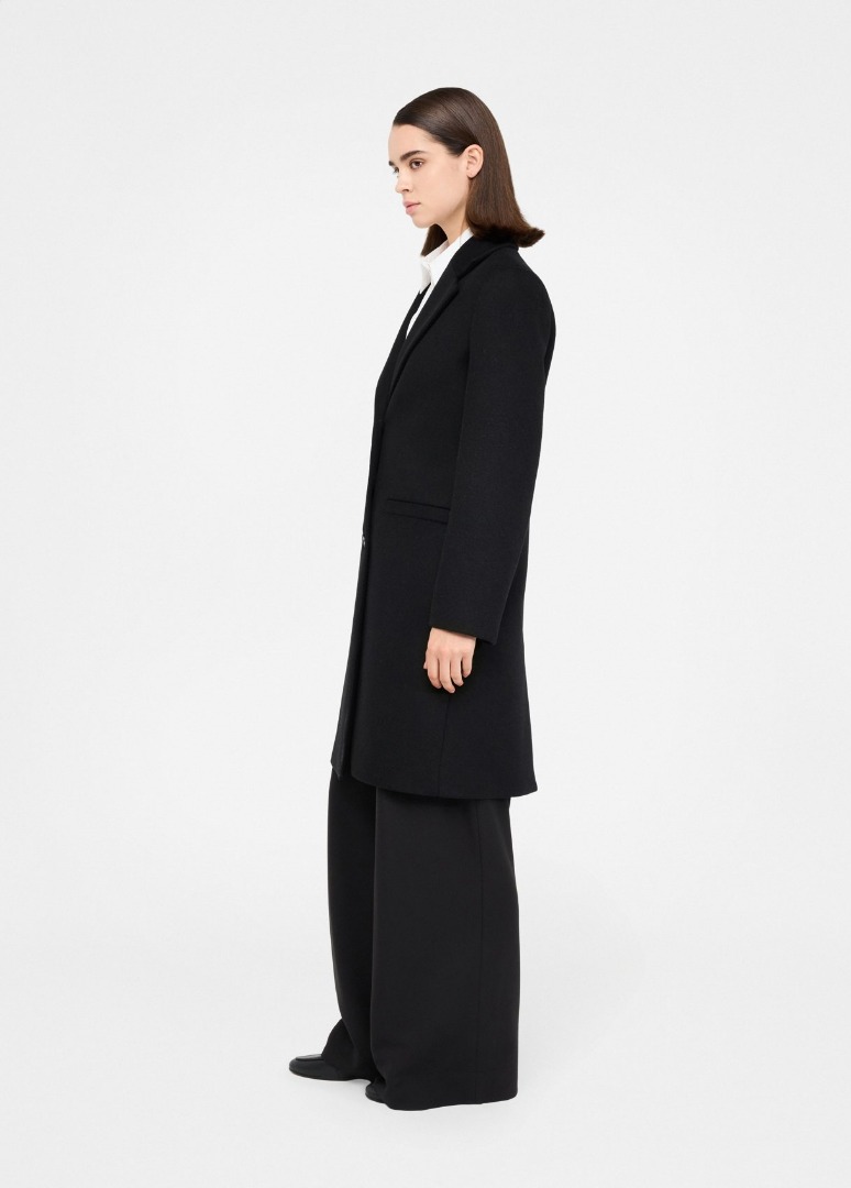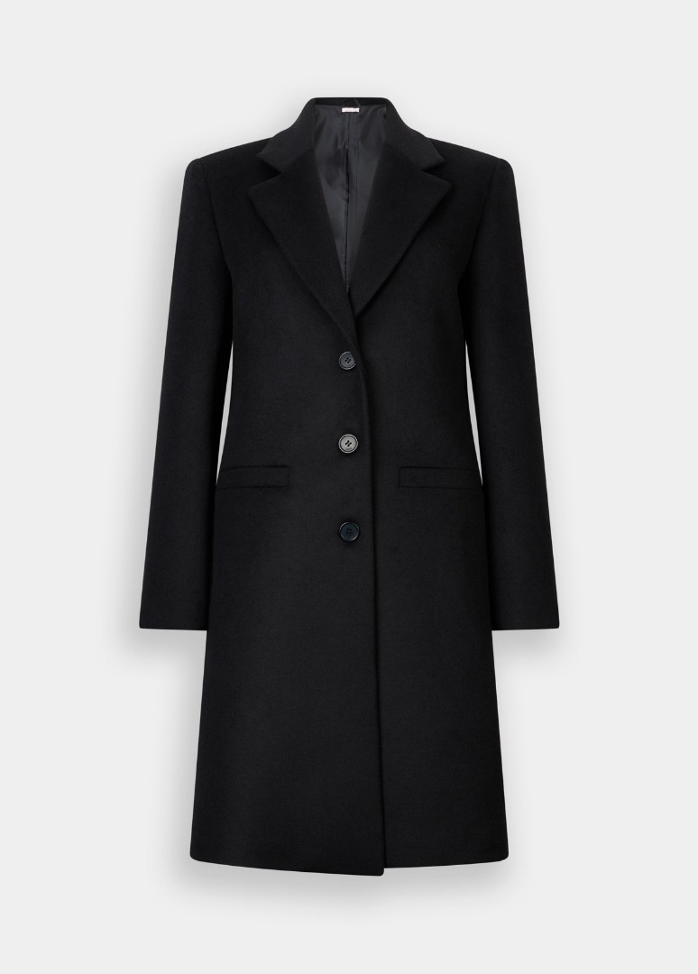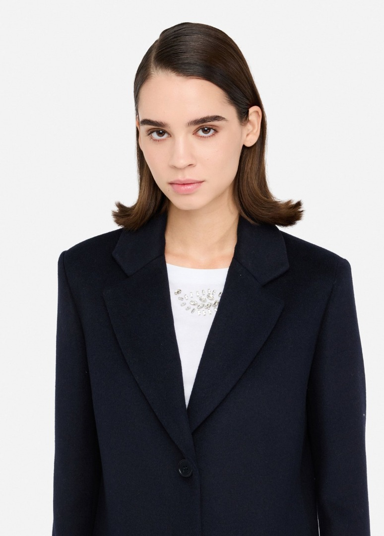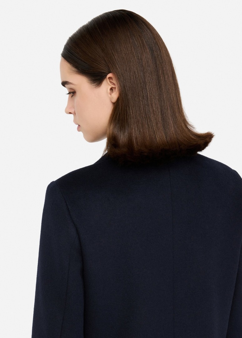 Dark blue wool coat Classic lapel Welt pockets Back vent Single-breasted three-button closure