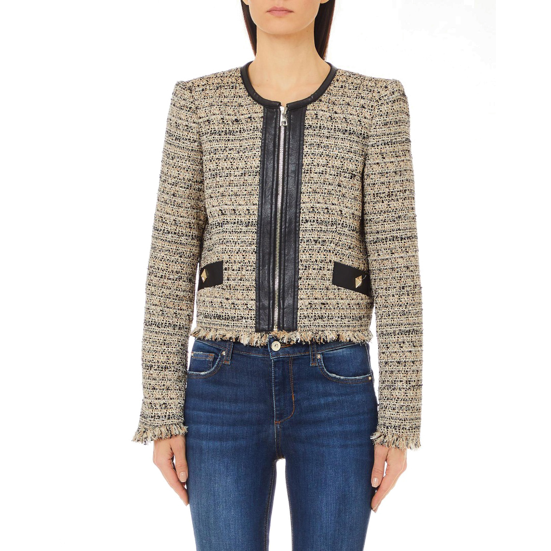 Short jacket in bouclé fabric of wool and lurex blend, round neckline and front zip closure with contrasting faux leather trim. Welt pockets at the waist in faux leather with metal application. Fringed sleeve hem and bottom.