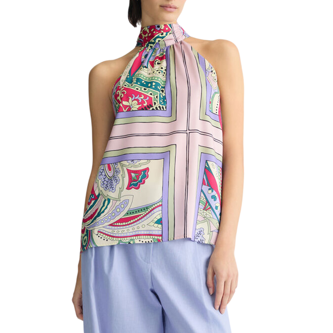 Multicolor top Made of satin All-over scarf print Halter neck Bow on the back