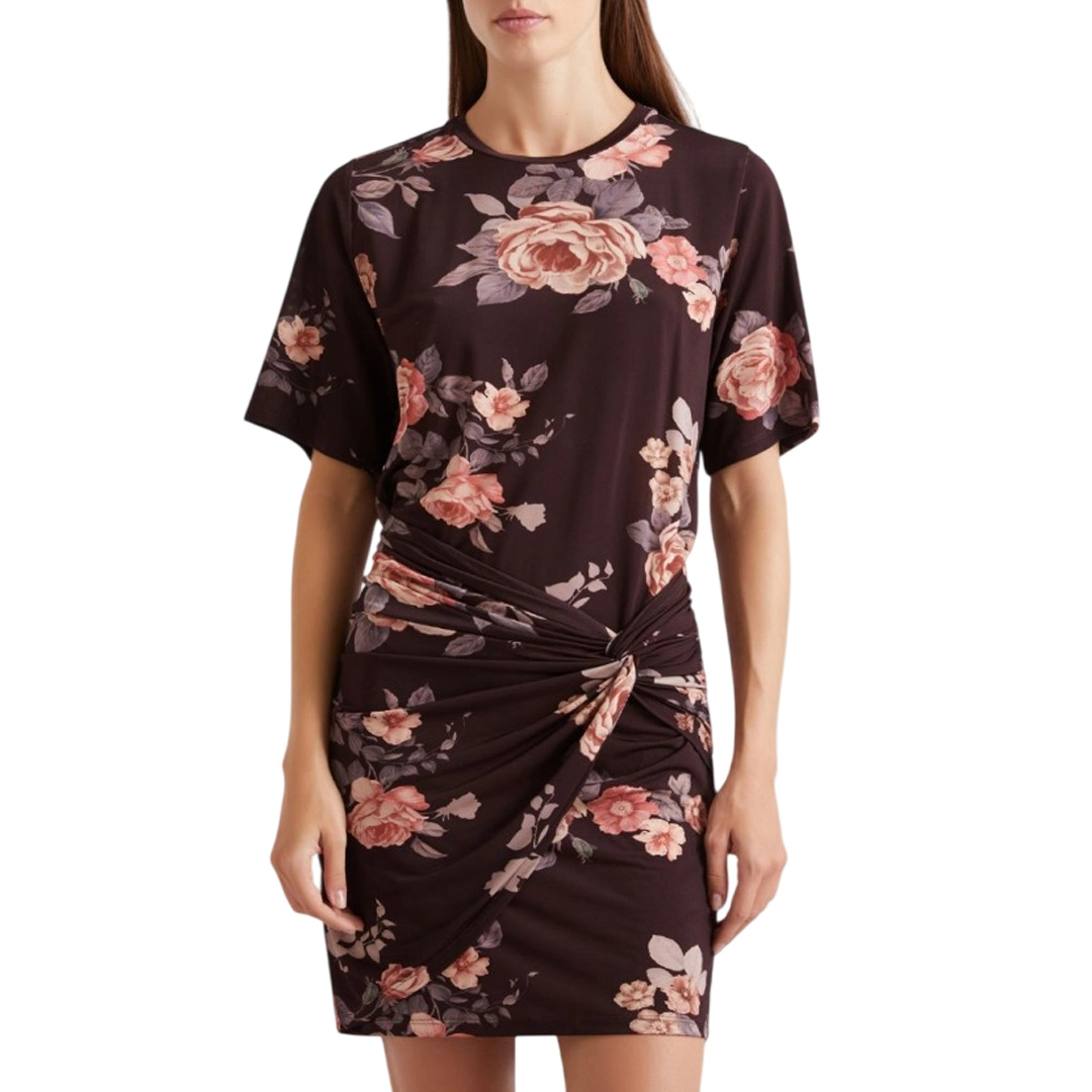 Floral patterns are a must-have for spring: on this soft jersey dress, they become the special touch for your special occasions. Featuring short sleeves and a skirt decorated with a knot and gathers. Printed viscose jersey dress. Regular fit. Crew neck. Short sleeves. Overlapping panel on the skirt with gathers and a knot.