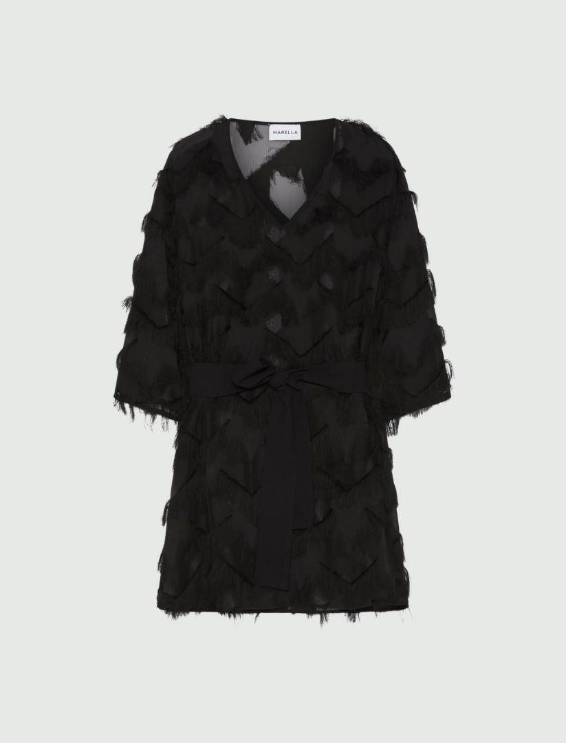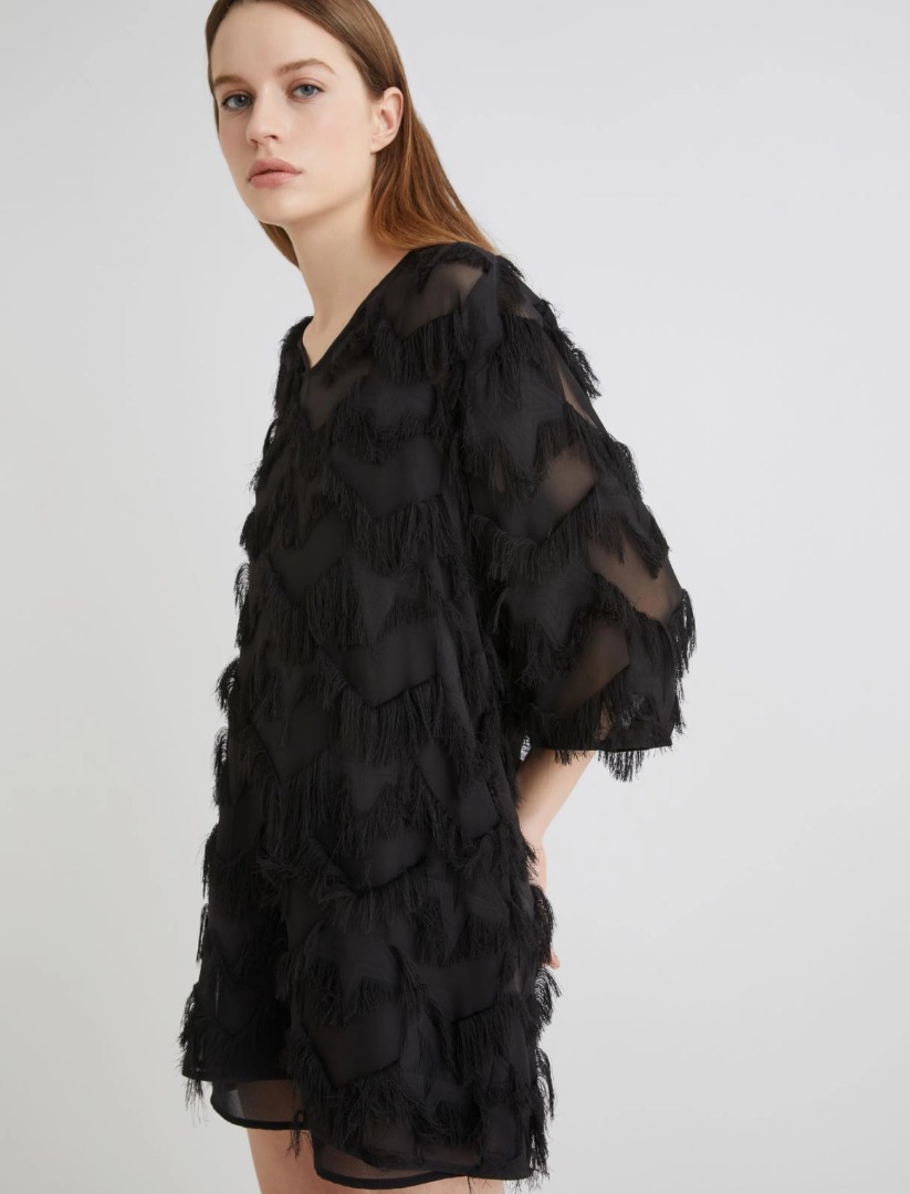 Short, semi-sheer, flowing: the fil coupé mini dress is the key piece for your evenings, to be completed with sandals and a sparkling clutch. Fil coupé mini dress with a star design. Regular fit. V-neck. Dropped shoulders. Georgette sash to tie at the waist. Removable slip in matching georgette.
