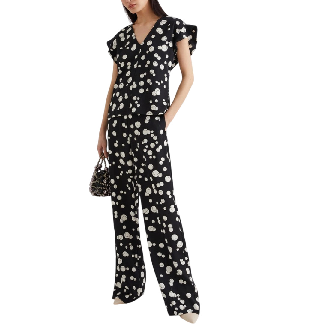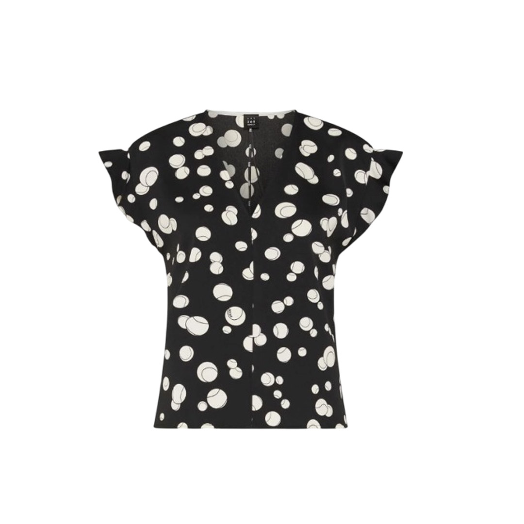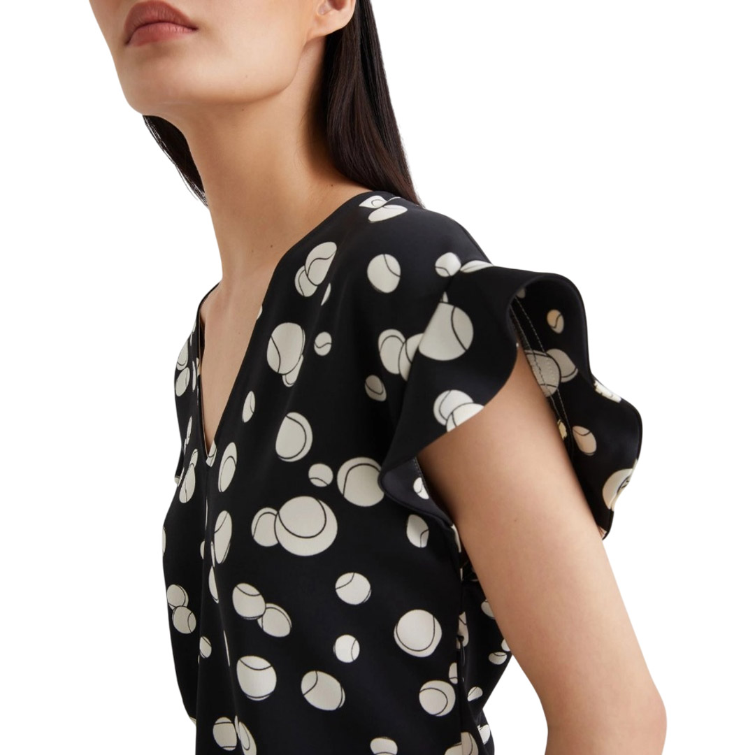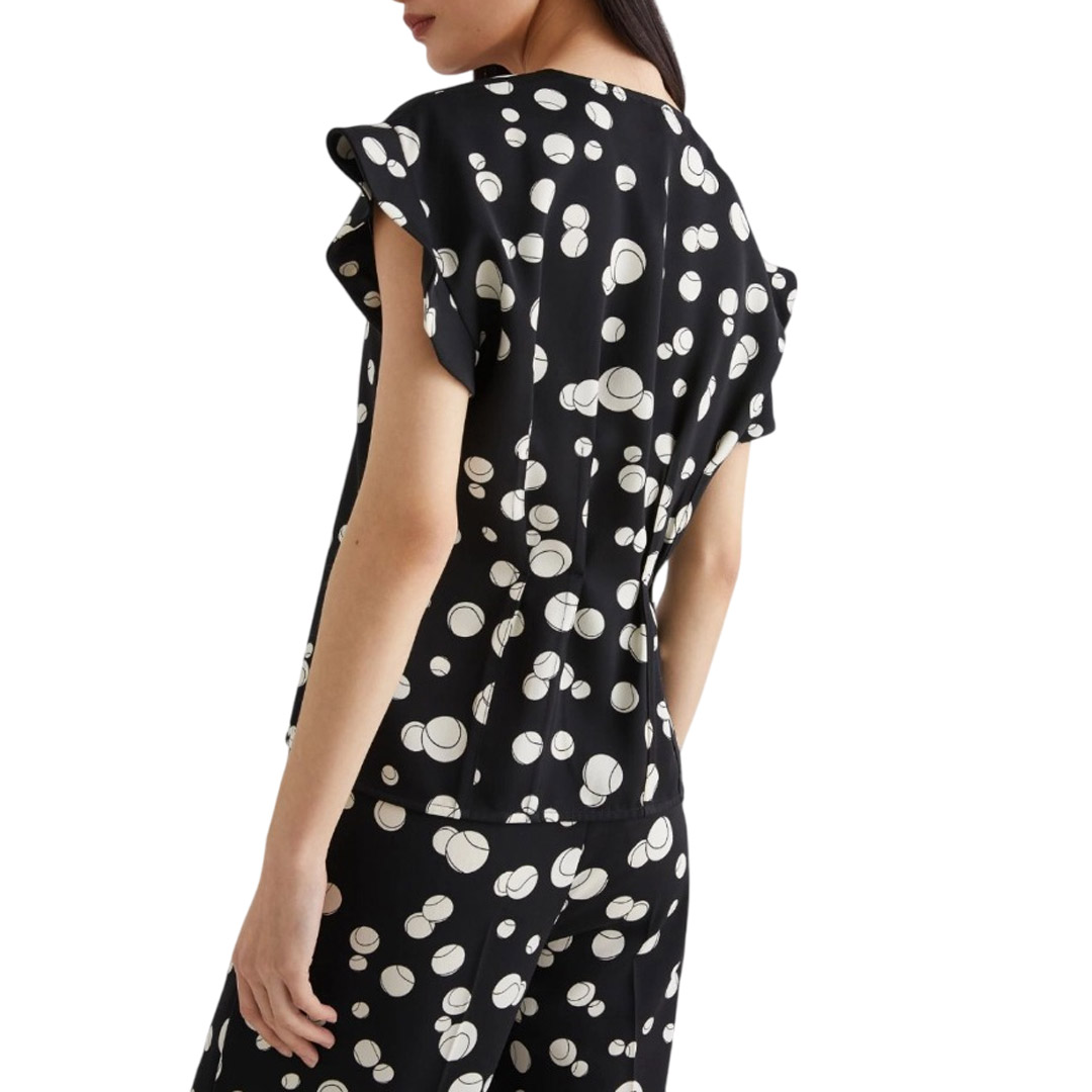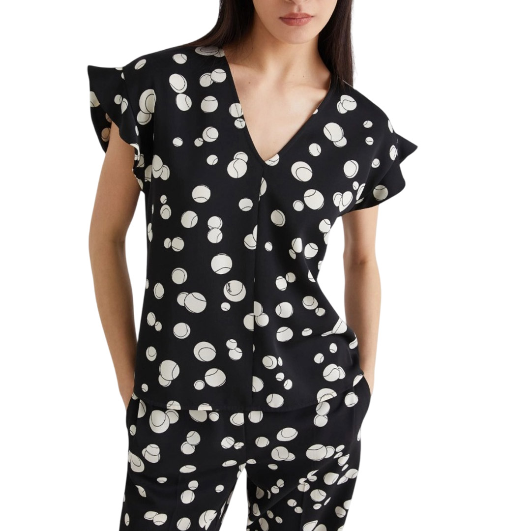 Bright in the new seasonal pattern, the satin blouse is always the protagonist of everyday looks. Wear it under a blazer during the day, with bare shoulders in the evening. Satin blouse printed with a 365 ball machine motif. Feminine fit, slightly tapered. V-neck. Side opening with hidden zip. Short cap sleeves. Stitched dart motifs on the back.