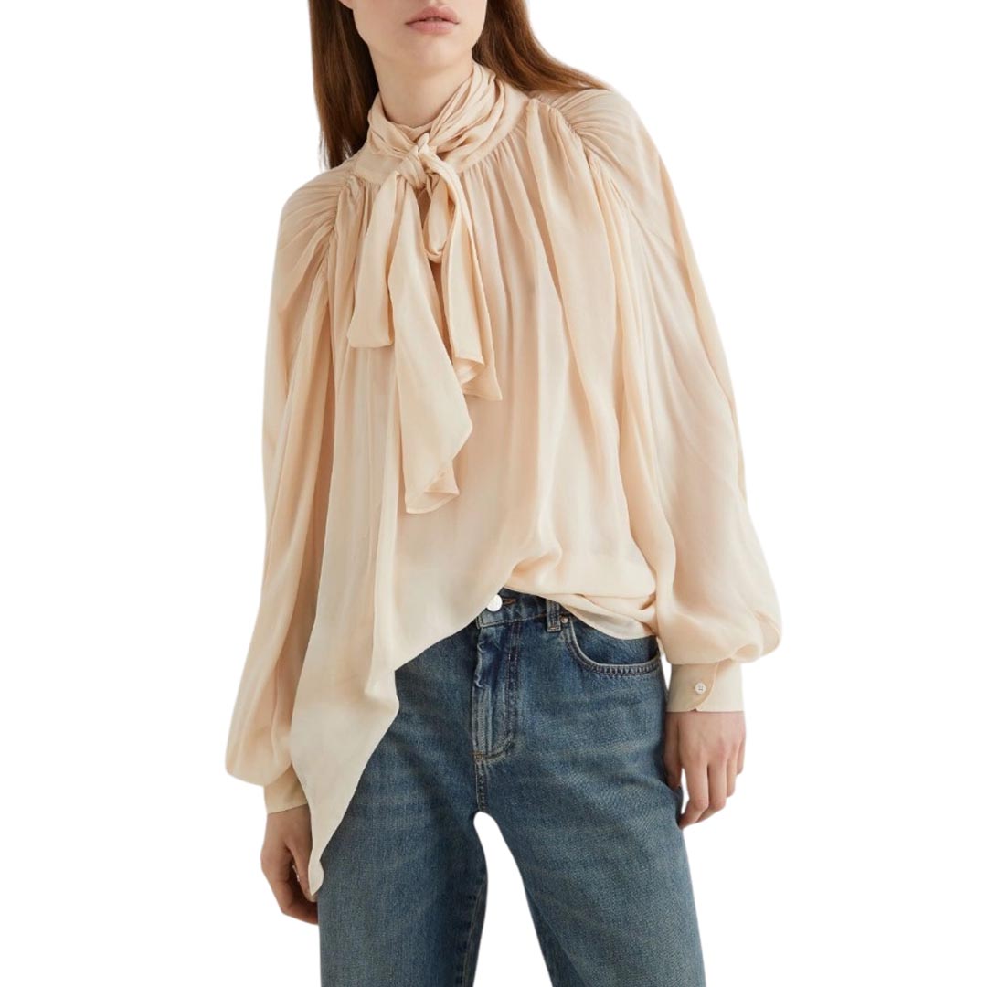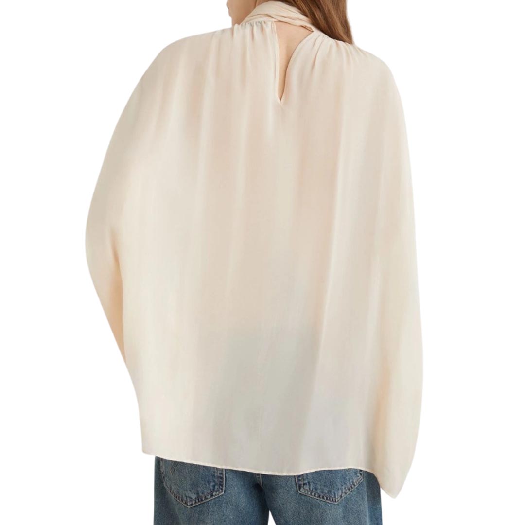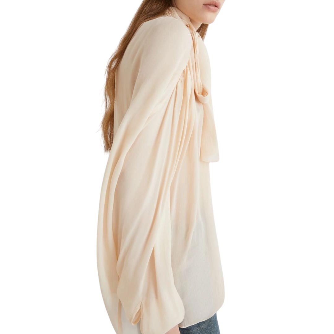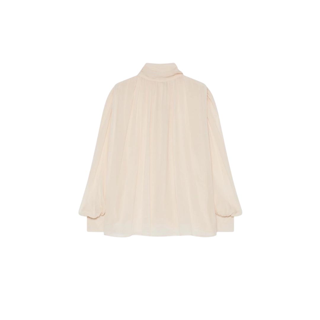 Main fabric containing raw materials derived from wood cellulose, a fibre obtained in compliance with forestry heritage Blouse in viscose georgette Regular fit High neck with back teardrop fastening and bow Gathered pattern along the entire neckline Long sleeve with puff at the cuff