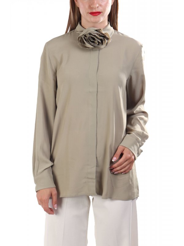 The fluid elegance of crepe de Chine transforms this shirt into a timeless piece of sophistication. Personalize your styling with the fabric flower, which can be easily tied at the neck or waist. Main fabric contains raw materials derived from wood cellulose, a fiber obtained with respect for forestry. Silk blend crepe de Chine shirt. Regular fit with a fluid silhouette. Shirt collar. Hidden button placket. Ribbon with floral detail to wear around the neck.