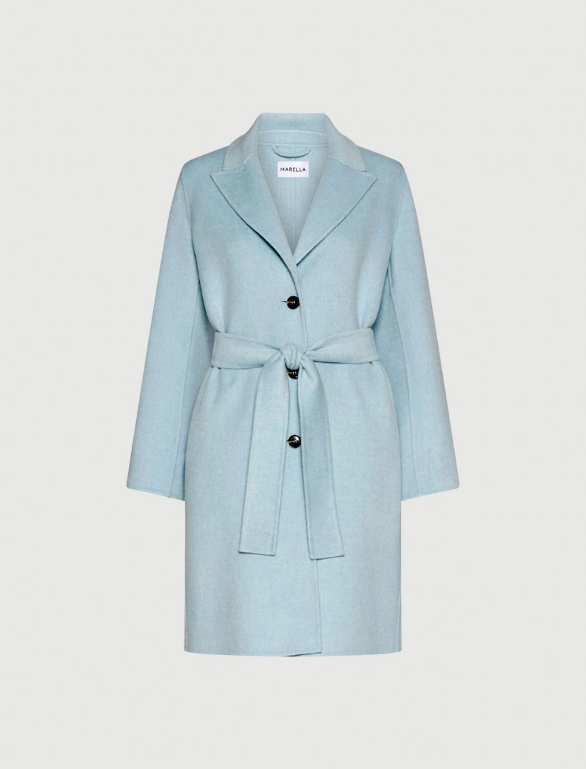 The soft warmth of double-faced wool in a coat you can wear over and over again. Soft, it cinchs at the waist with a belt to match any outfit. Main fabric contains wool from animals raised in compliance with animal welfare principles. Double-faced wool blend coat, unlined. Straight fit. Lapel collar. Single-breasted closure with buttons and belt. Inset side pockets.