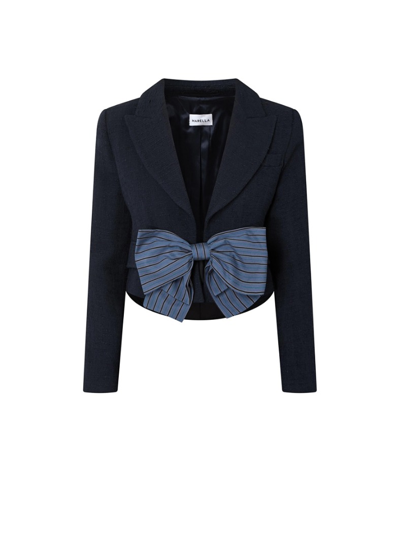 Marella Mllfibbia jacket with ribbon, made of cotton fabric, straight silhouette model, short length, lapel collar, long sleeves, patch pockets, maxi ribbon with striped pattern in contrasting shades.