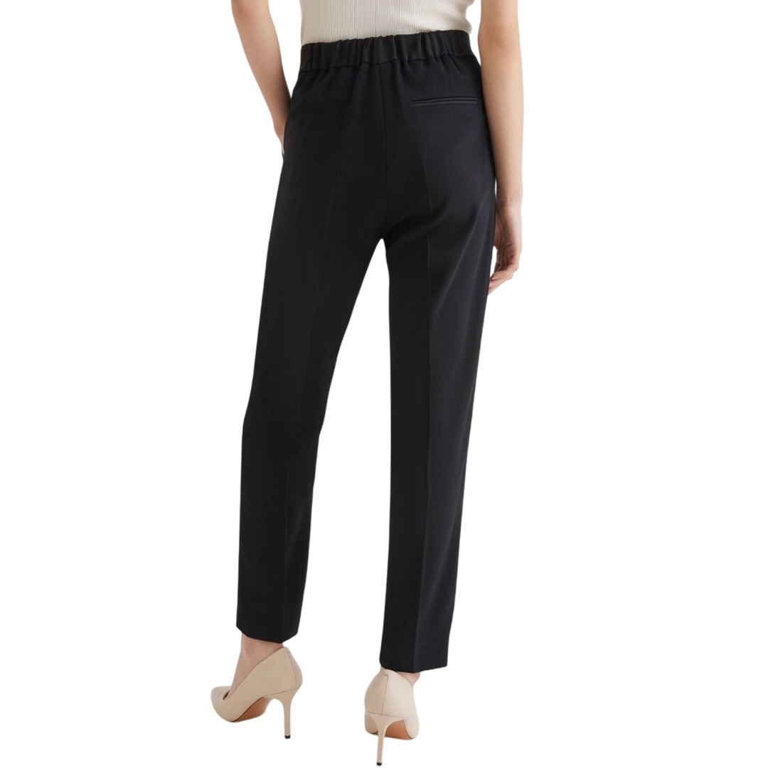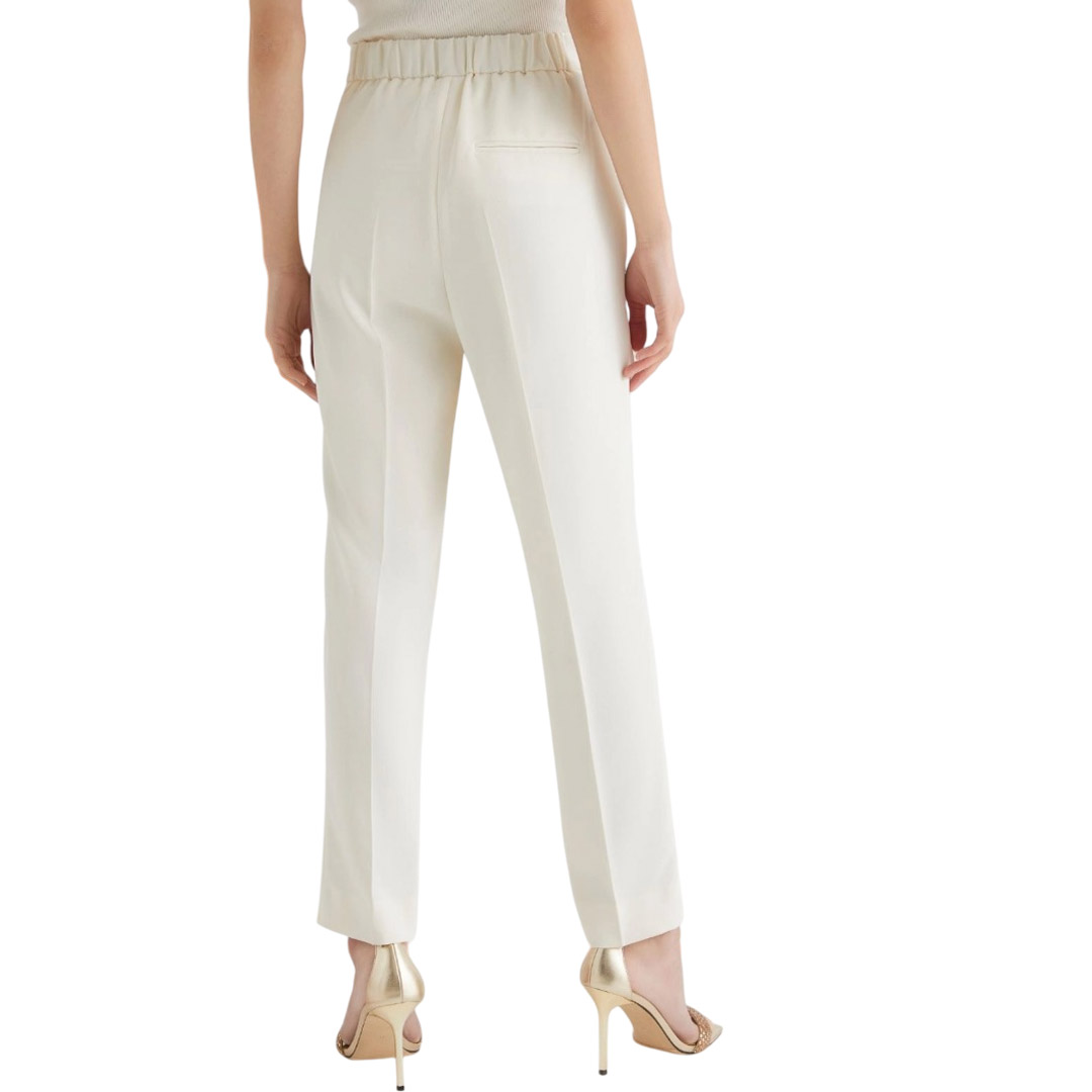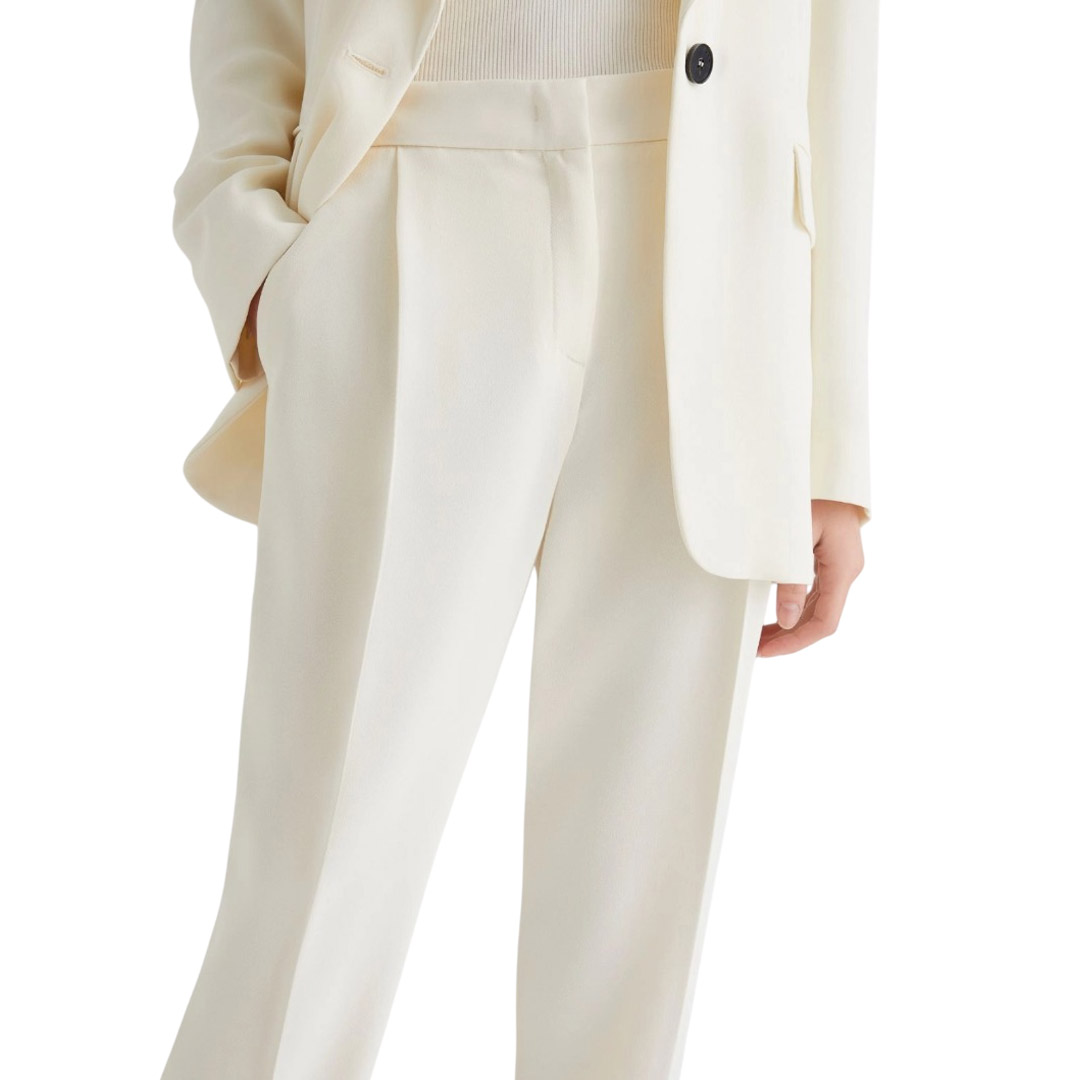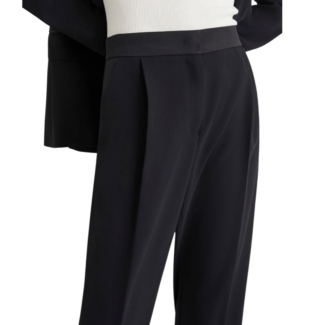 Versatile, functional, and always impeccable, these satin-lined trousers slim the silhouette and accompany you from dusk to dawn. Pair them with a blazer for the day and a sparkling top for the evening, you'll always be perfect. Main fabric containing more than 50% recycled polyester. Satin-lined crepe trousers. Straight fit. Hook-and-eye closure and elastic insert on the back waist. Side slant pockets and a welt pocket on the back. Ironed crease on the front and back.