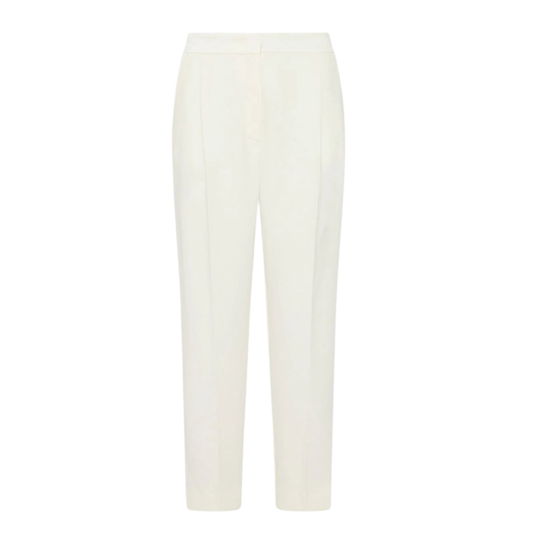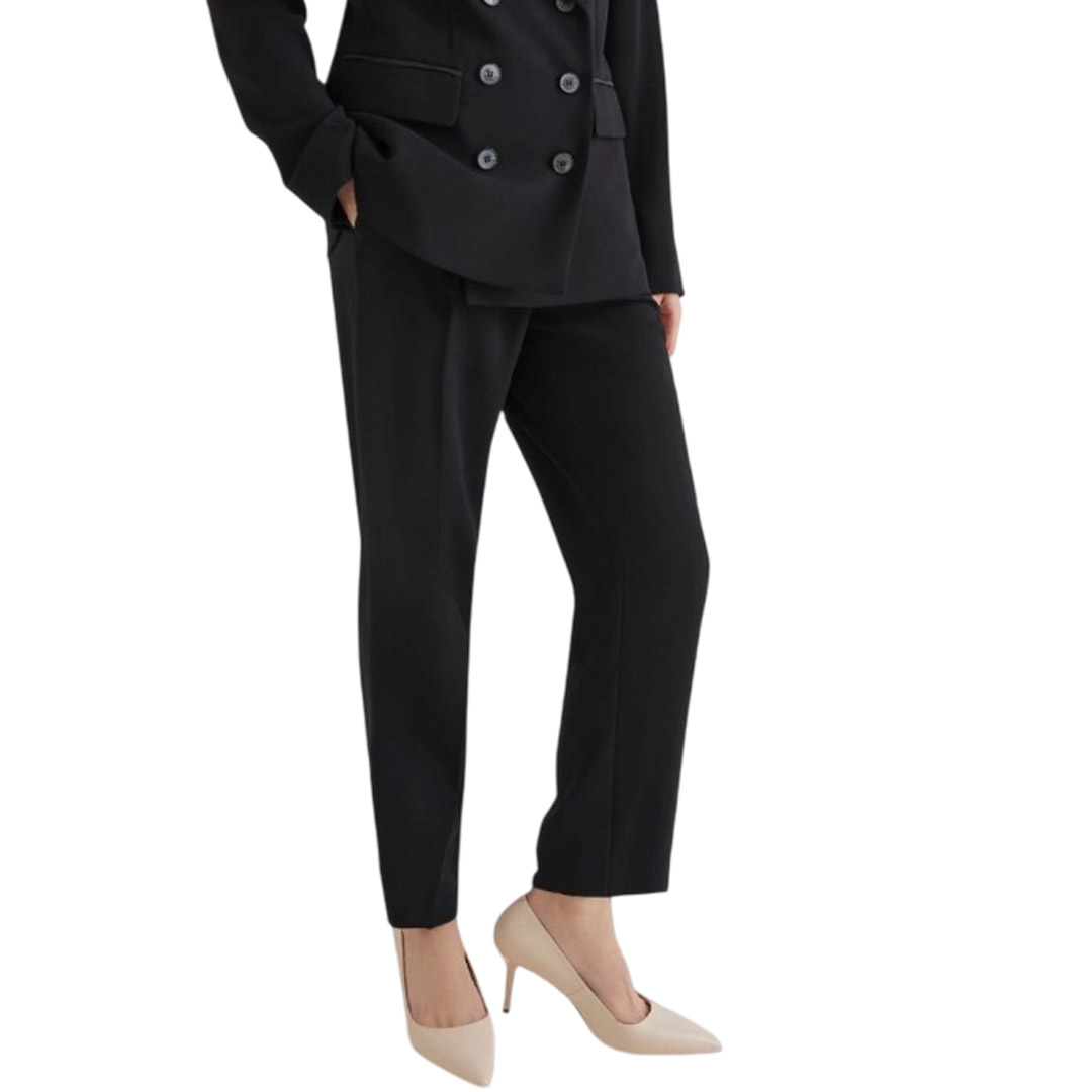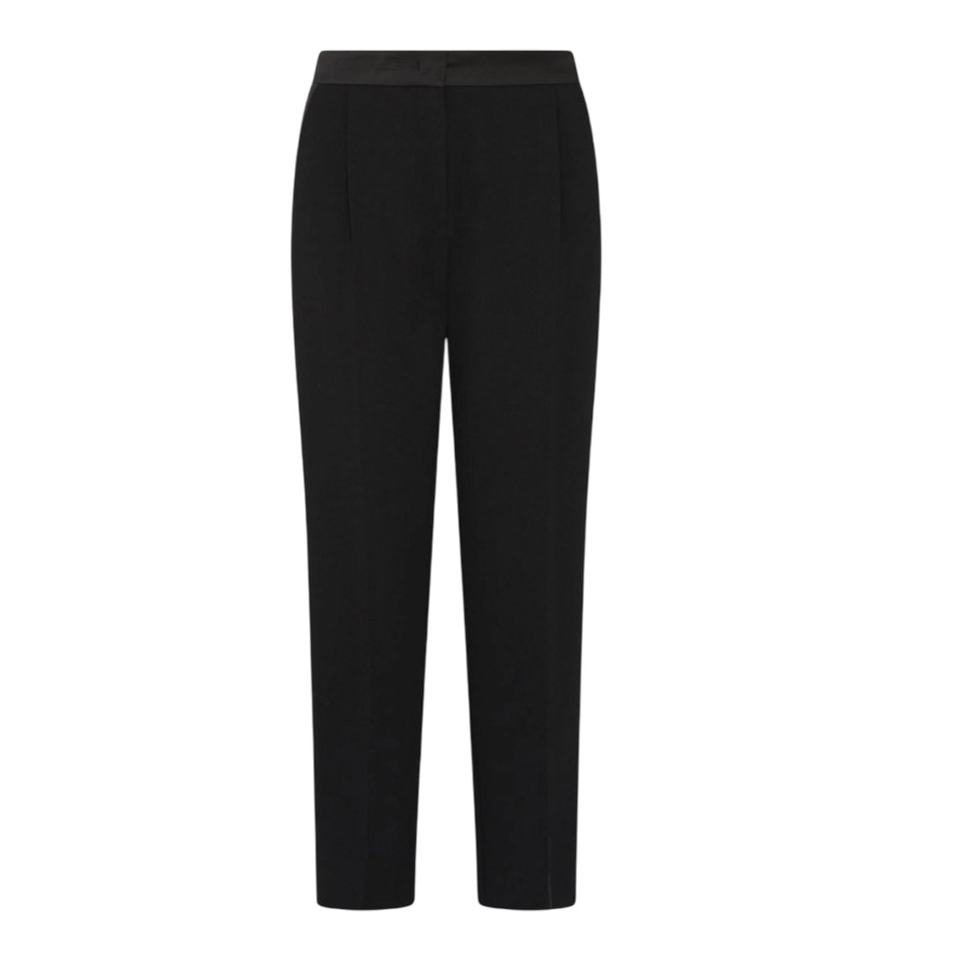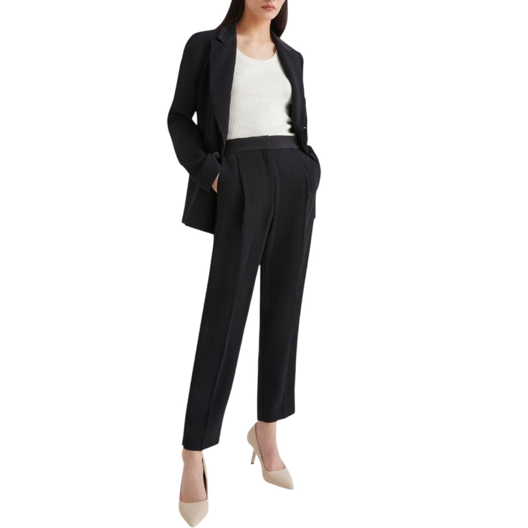 Versatile, functional, and always impeccable, these satin-lined trousers slim the silhouette and accompany you from dusk to dawn. Pair them with a blazer for the day and a sparkling top for the evening, you'll always be perfect. Main fabric containing more than 50% recycled polyester. Satin-lined crepe trousers. Straight fit. Hook-and-eye closure and elastic insert on the back waist. Side slant pockets and a welt pocket on the back. Ironed crease on the front and back.